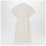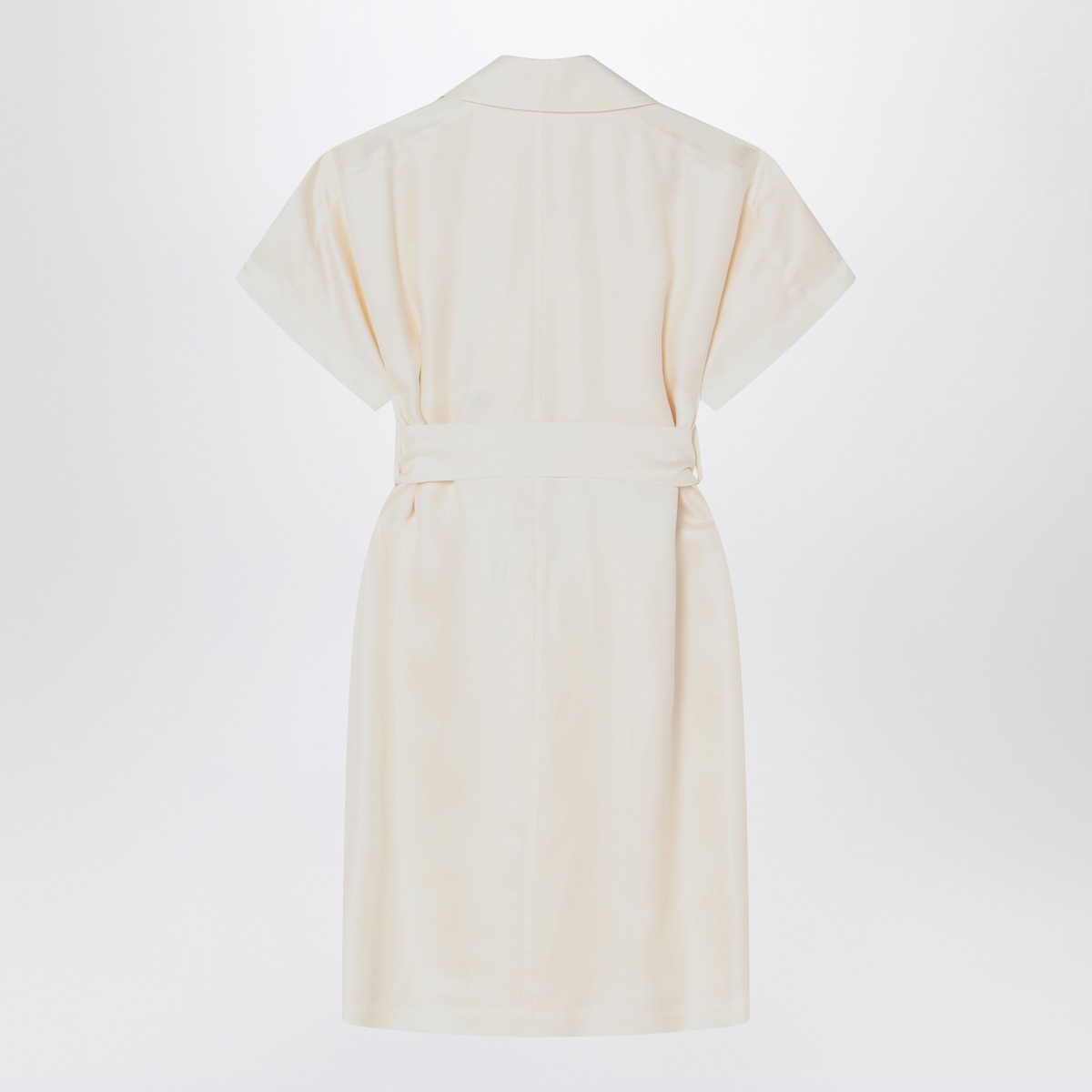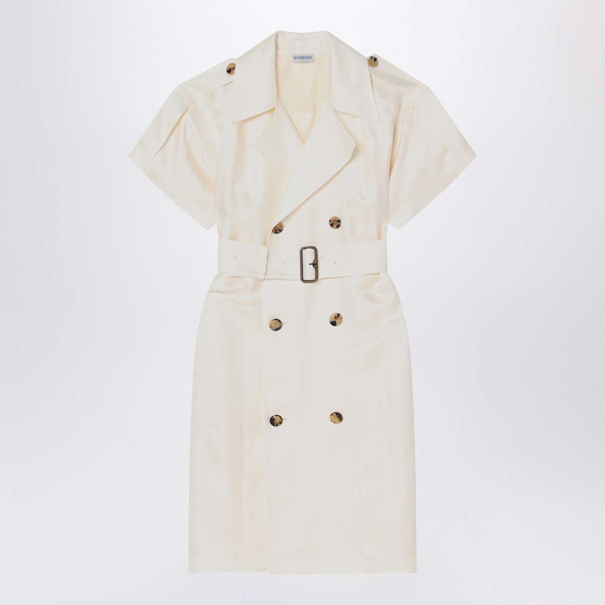 Ivory viscose twill trench coat by Burberry, characterized by short sleeves, epaulettes on the shoulders, double-breasted front buttoning, adjustable and removable waist belt with buckle, and two side welt pockets.