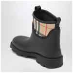 Burberry low ankle boots in black rubber, featuring nylon inserts with Check pattern, Equestrian Knight Design embossed on the front, round toe and rubber sole.