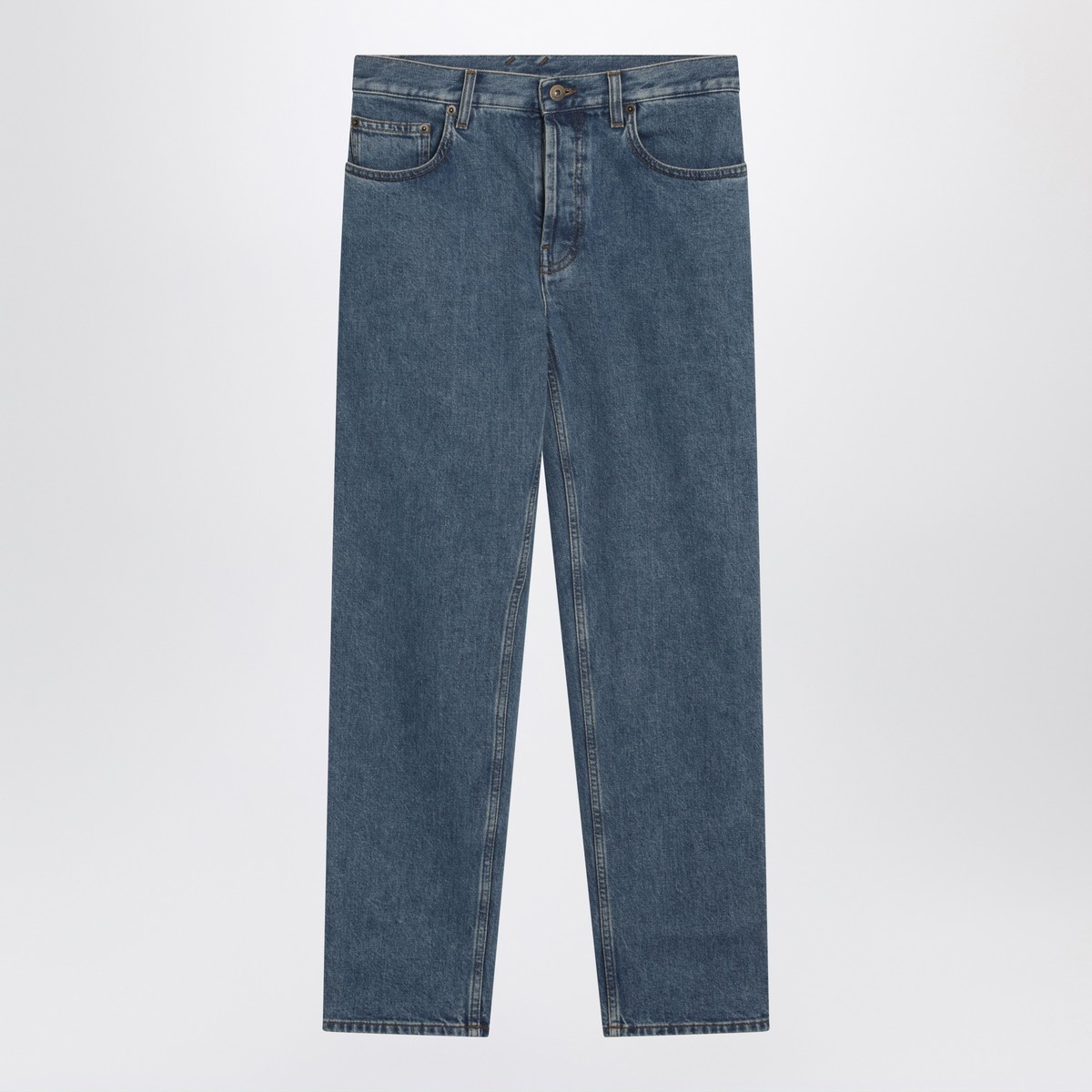 Jeans by Burberry in medium blue cotton denim, featuring front zip and button closure, belt loops, five classic pockets, and back logo patch.