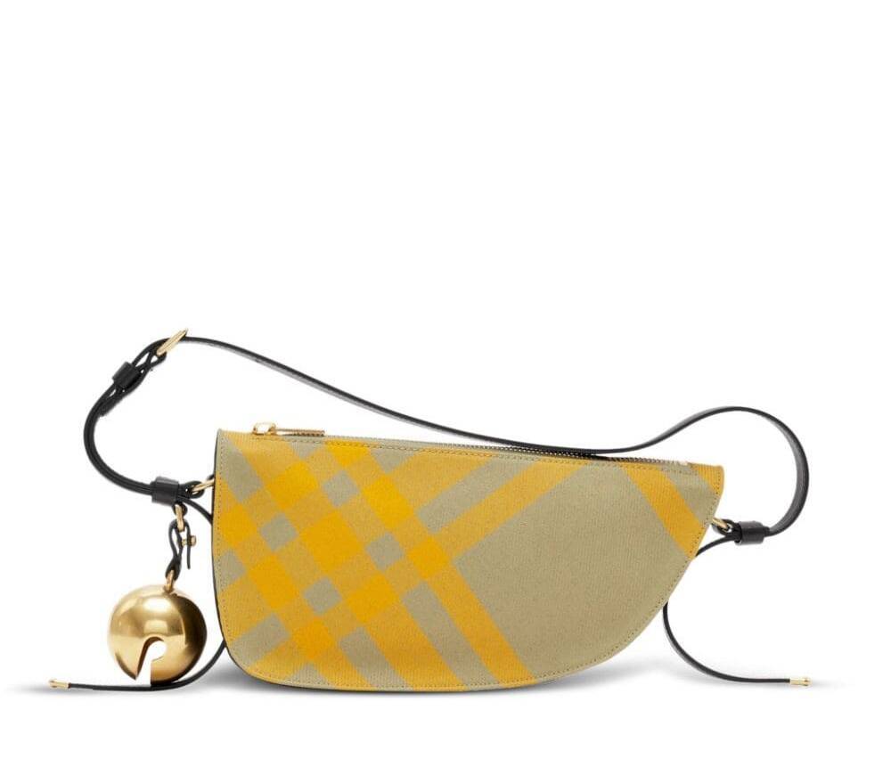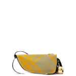 mustard yellow/beige calf leather/lambskin check pattern bell charm adjustable shoulder strap top zip fastening main compartment Shield mini shoulder bag