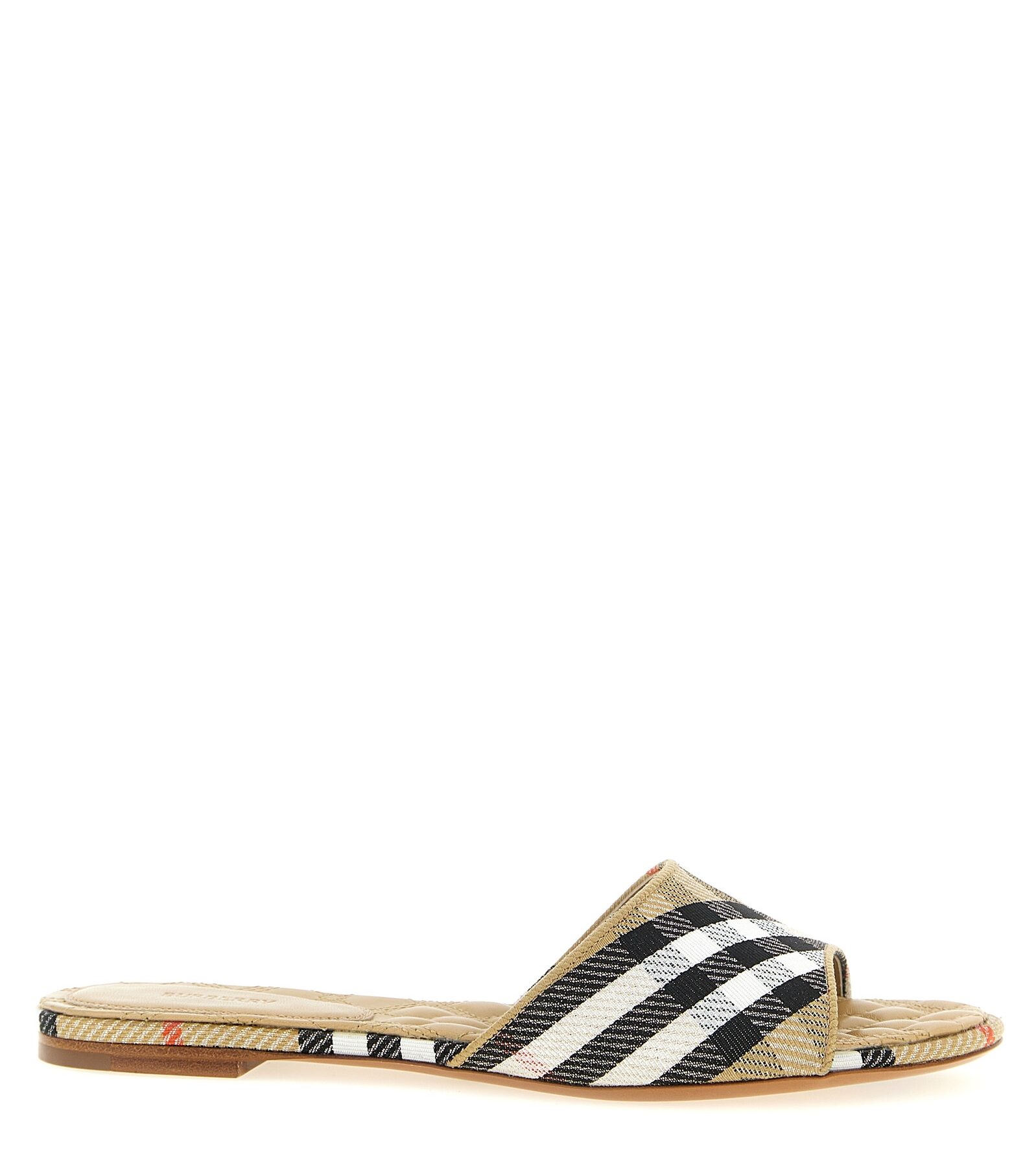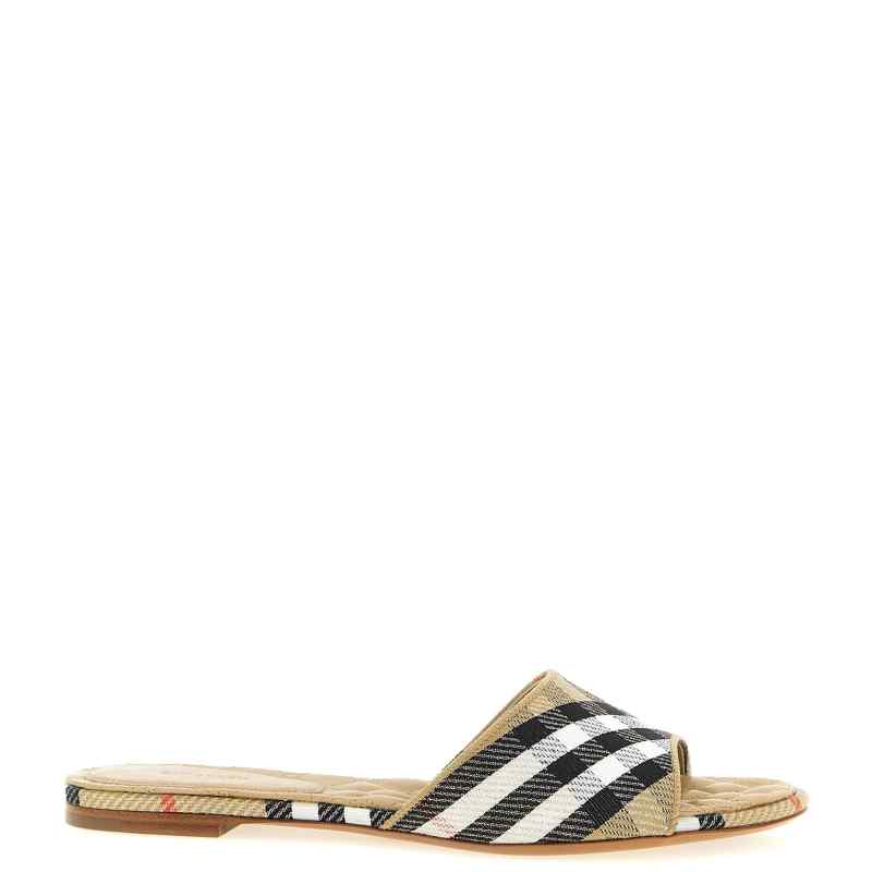 Sloane’ slides in cotton blend woven with burberry check and woven with metallic threads, Almond toe, Quilted leather insole, Leather sole with engraved ‘equestrian knight design’. Size and Fit – Eu women
