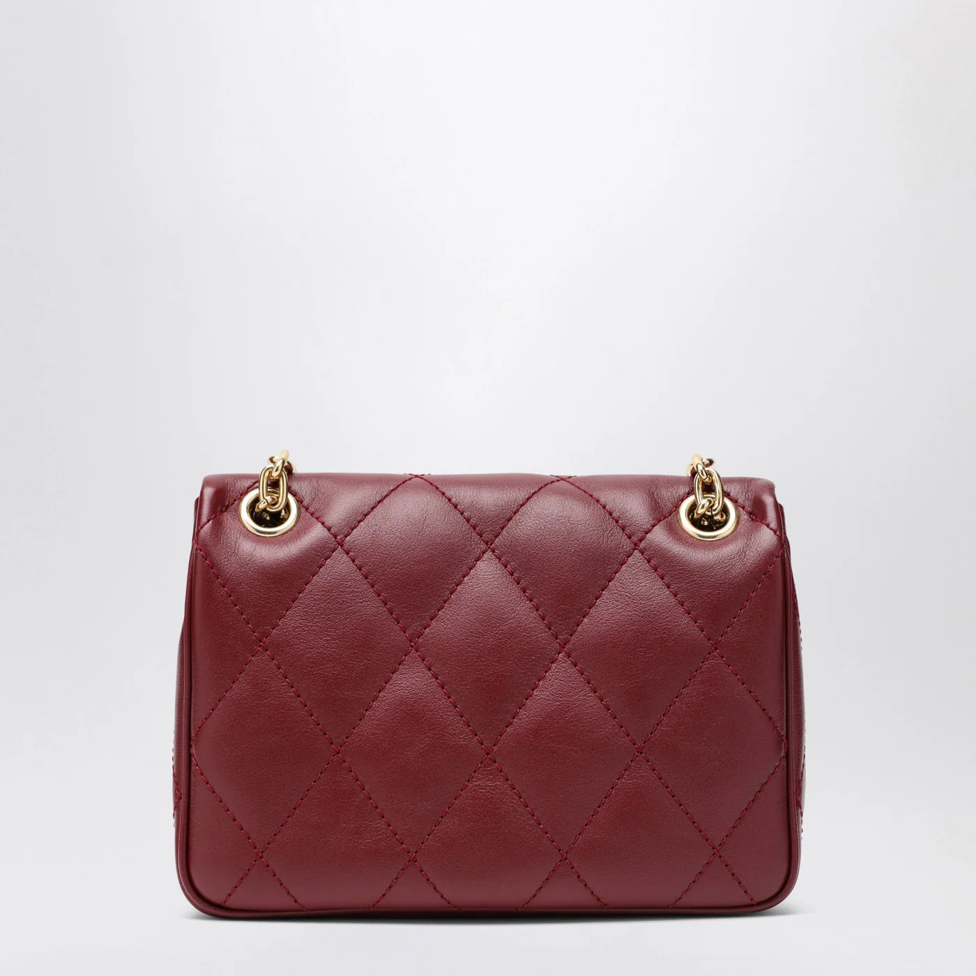 Medium shoulder bag by Burberry in quilted burgundy leather characterized by a chain and leather shoulder strap fold-over flap with magnetic closure internal zip pocket hand-painted edges brushed metal elements EKD engraved on the front and cotton lining.