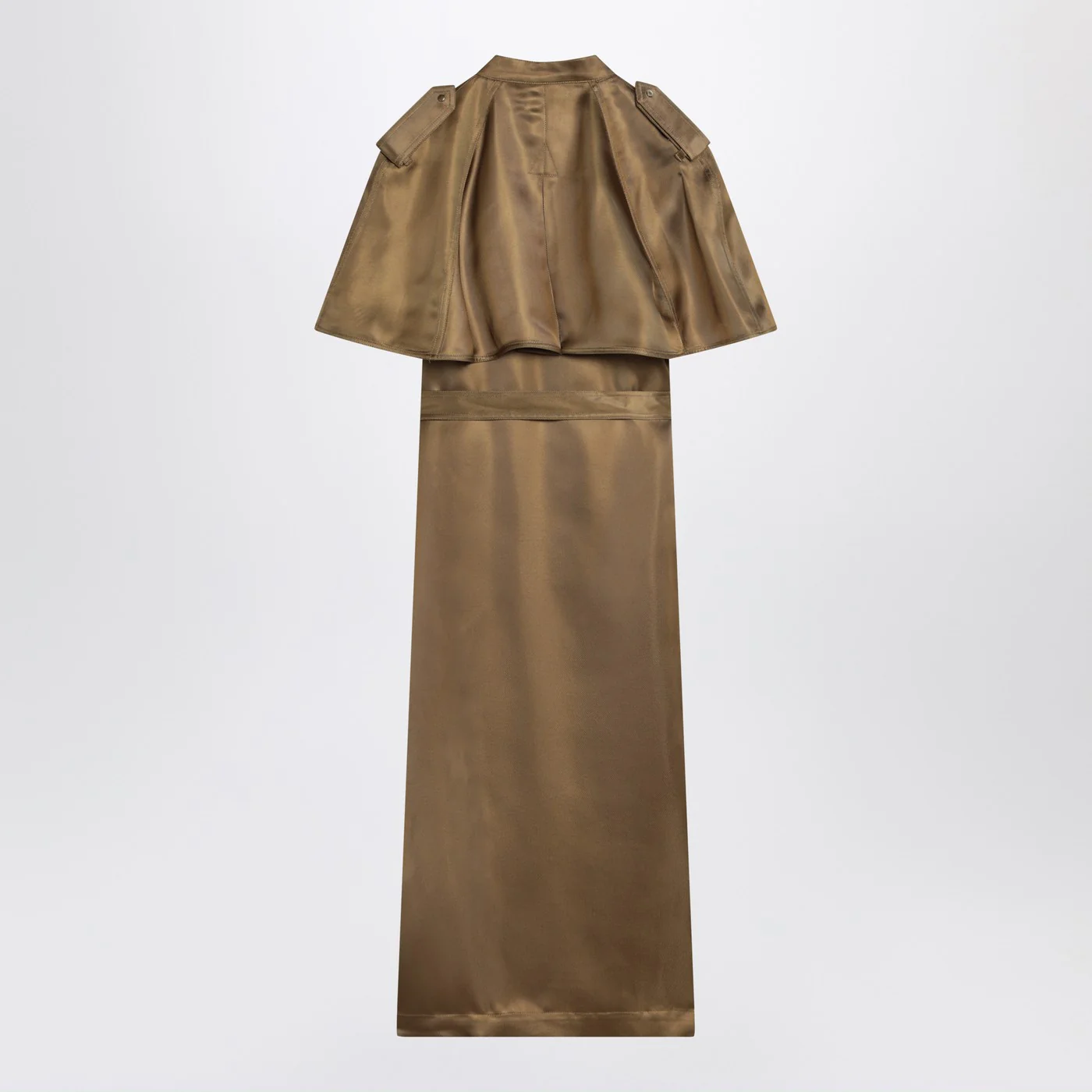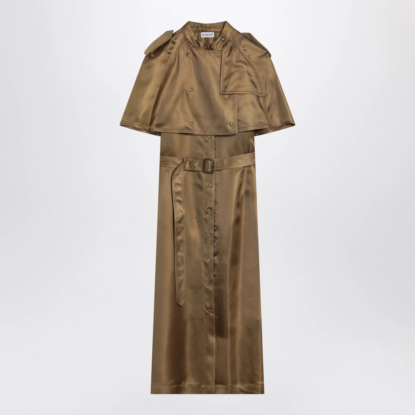 Burberry trench coat in Walrus green viscose twill featuring a cape adjustable waist belt snap button closure snap button collar two side welt pockets and regular fit.