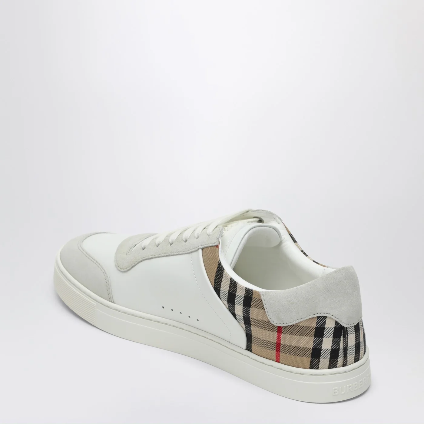 Burberry low-top sneaker in white leather with suede details and Check pattern featuring lace-up closure and rubber sole.