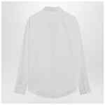 White cotton poplin shirt by Burberry, featuring beige Check lining at the cuffs and placket, tonal embroidered Equestrian Knight Design logo on the chest, front button closure, pointed collar, long sleeves with buttoned cuffs, curved hem, and regular fit.