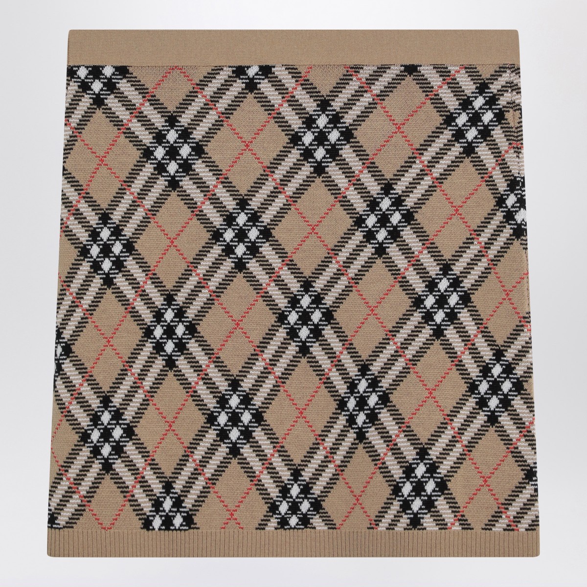 Burberry mini skirt in a wool and mohair blend featuring a Check pattern, elasticated waist, and ribbed hem.