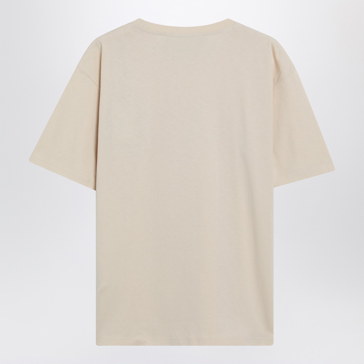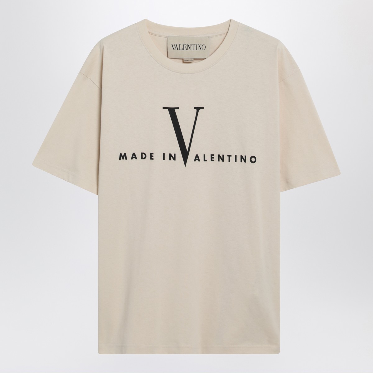 Crew-neck T-shirt by Valentino in butter-colored cotton, featuring short sleeves, contrasting Made in Valentino print on the chest, ribbed neckline, and regular fit.
