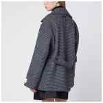 Short double-breasted coat by Calvin Klein in dark grey wool blend with houndstooth pattern, featuring wide classic lapels, front button fastening, wide long sleeves (one with logo patch), two side pockets, small rear logo patch, and back strap detail with buttons.