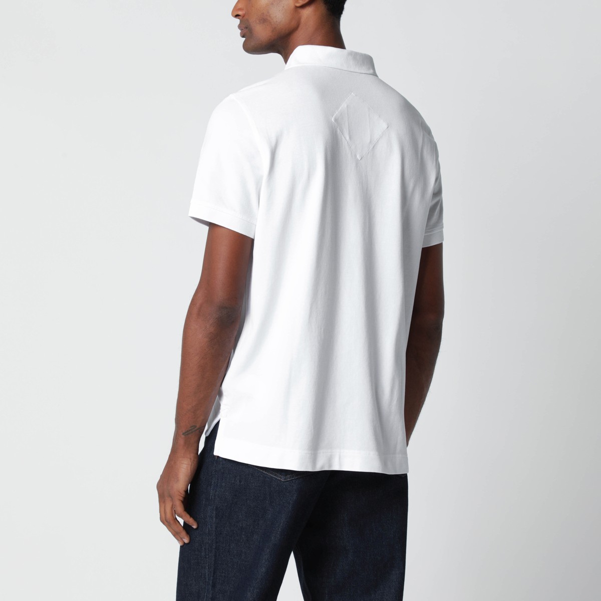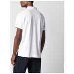 White cotton Canada Goose polo, characterized by short sleeves, logo patch on the chest, buttons on the front, and side slits.