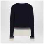 Navy blue and ivory virgin wool cardigan by Valentino, featuring a V-neck, long sleeves, front button closure, two applied pockets on the front, one with contrasting Chez Valentino embroidery and ribbed edges.