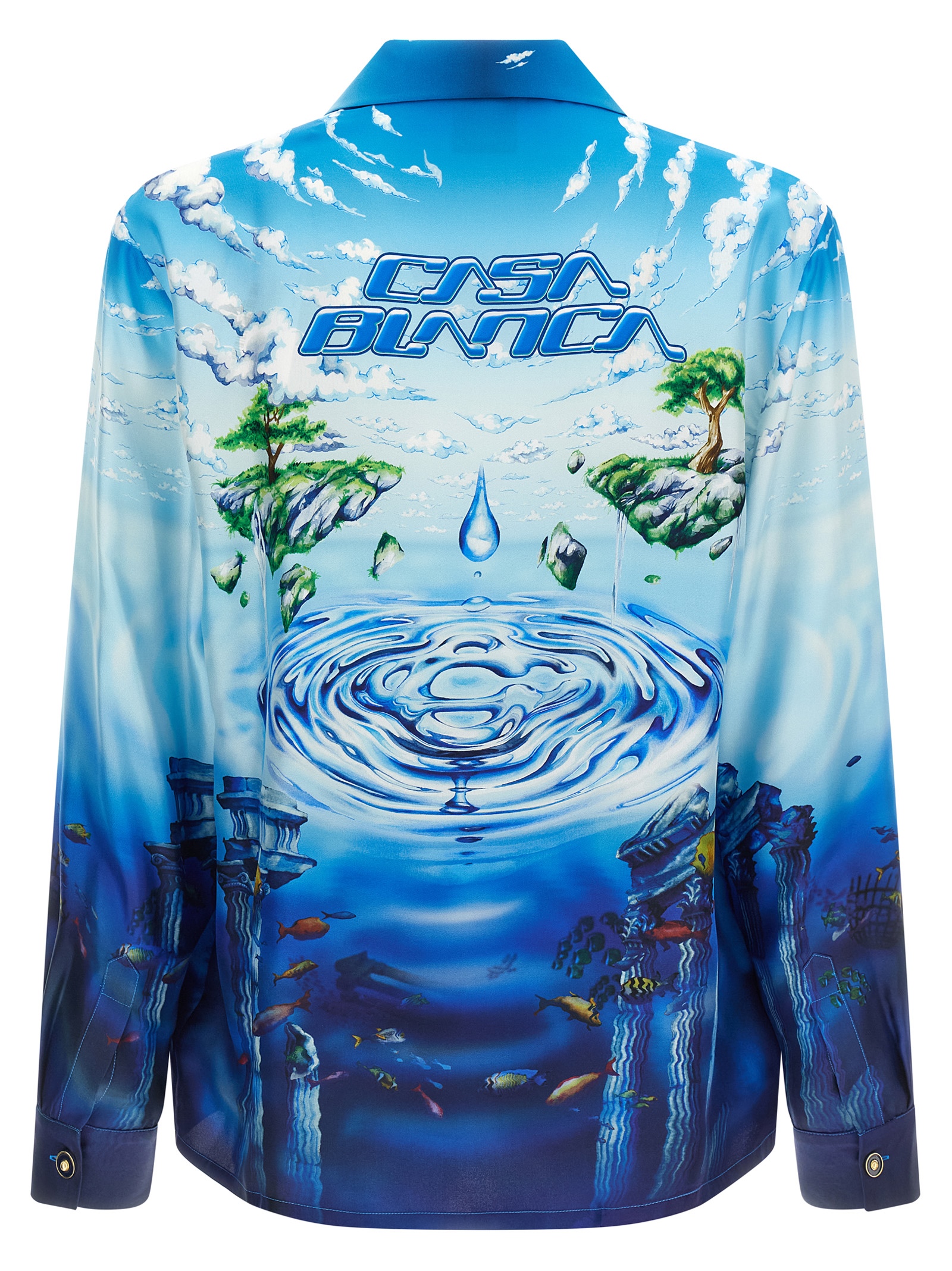 The maison’s ‘Lost Atlantis’ silk twill shirt with ‘Water Atlantis’ artistic print made with digital graphics and hand painting, Cuban collar, breast pocket, concealed front button closure, long cuffed sleeves.
