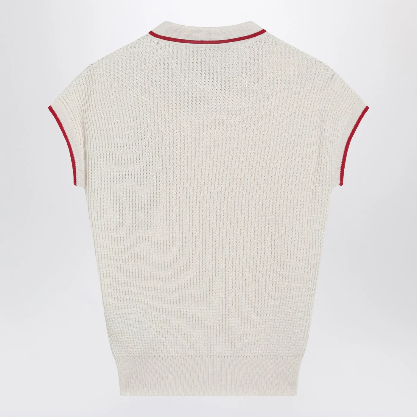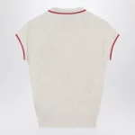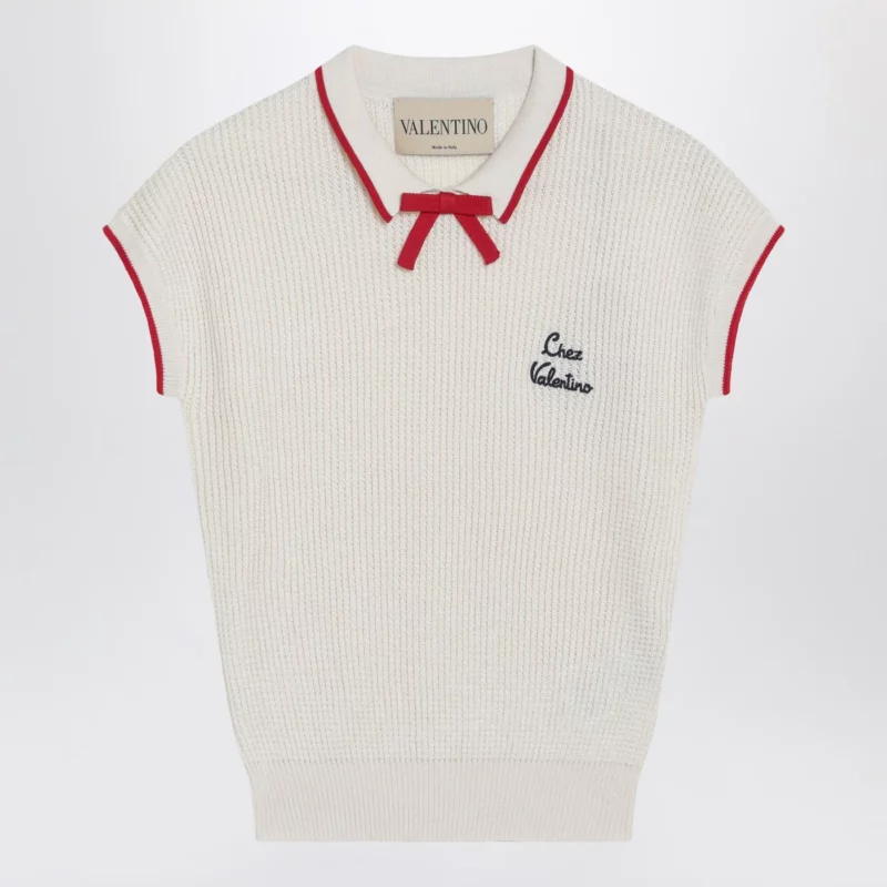Top by Valentino Garavani in ivory cotton blend Knit construction Collar Short sleeves with red contrast trims Central bow detail Chez Valentino embroidery on the chest Ribbed hem. Size and Fit – Model wears size S Model measurements: Height: 181 cm Chest: 81 cm Waist: 62 cm Hips: 89 cm