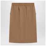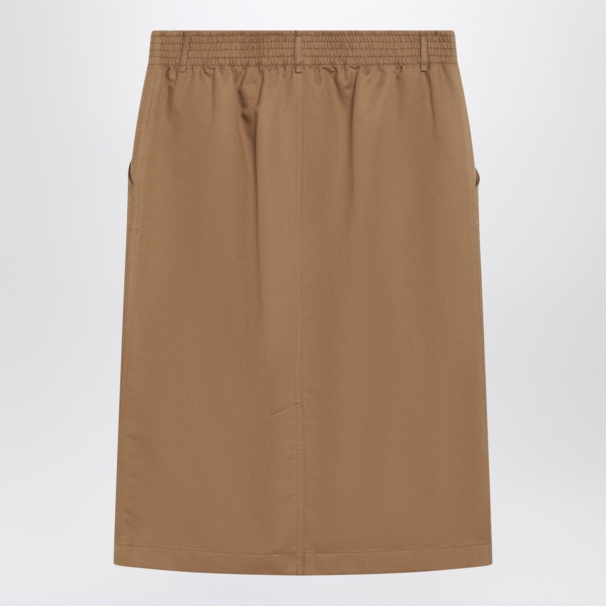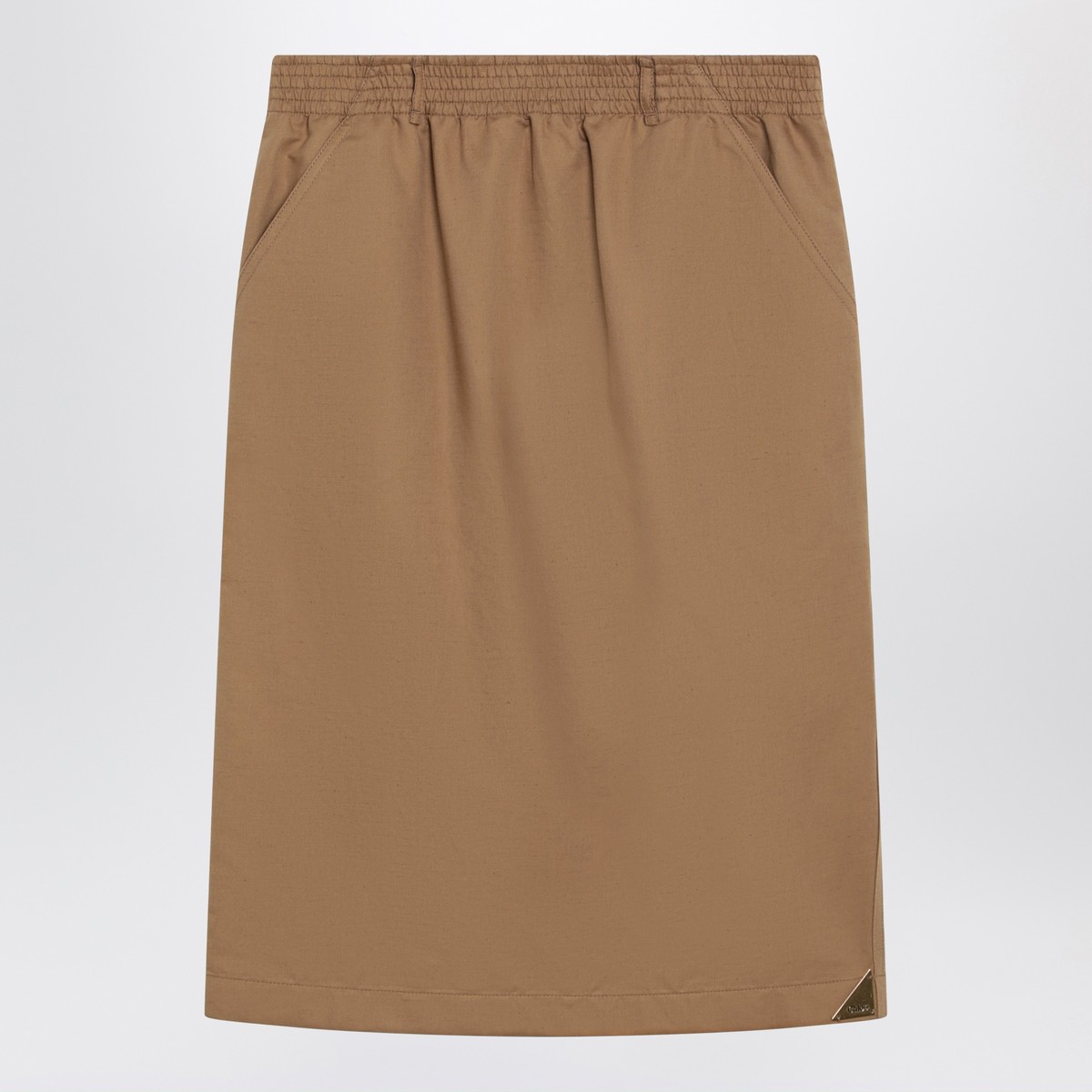 Beige cotton and linen blend midi pencil skirt by Chloé, featuring two side pockets, elasticated waist with belt loops, straight fit and triangular detail with engraved lettering logo at the hem.