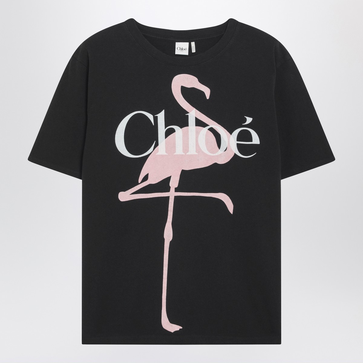Chloé black baby-fit cotton T-shirt featuring crew neck, front logo print, flamingo print, short sleeves and straight hem.
