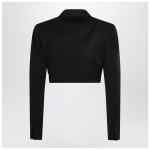 Black grain de poudre wool cropped jacket by Chloé, featuring single-breasted button closure, tonal belt with gold-tone buckle, classic lapels, and long sleeves with buttoned cuffs.
