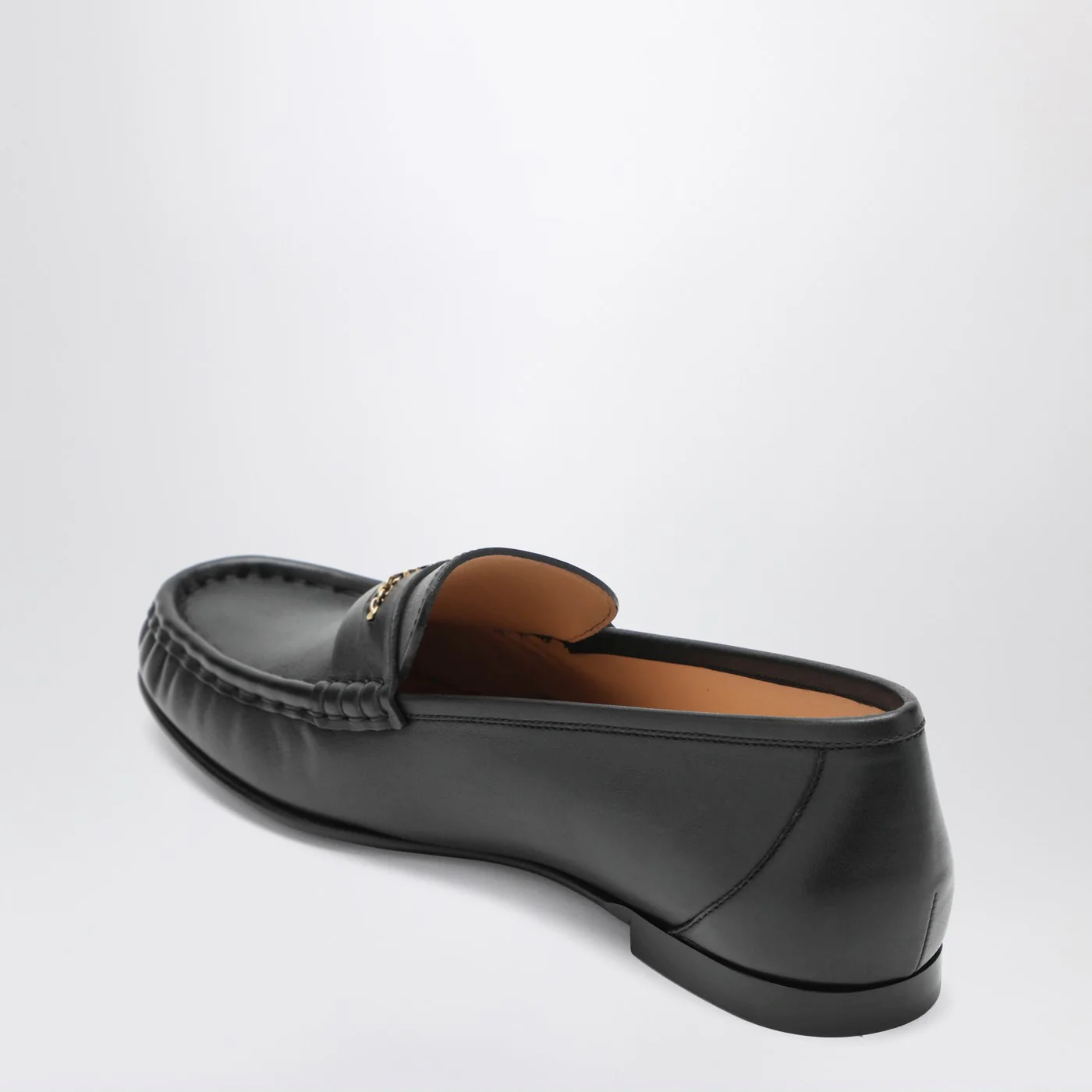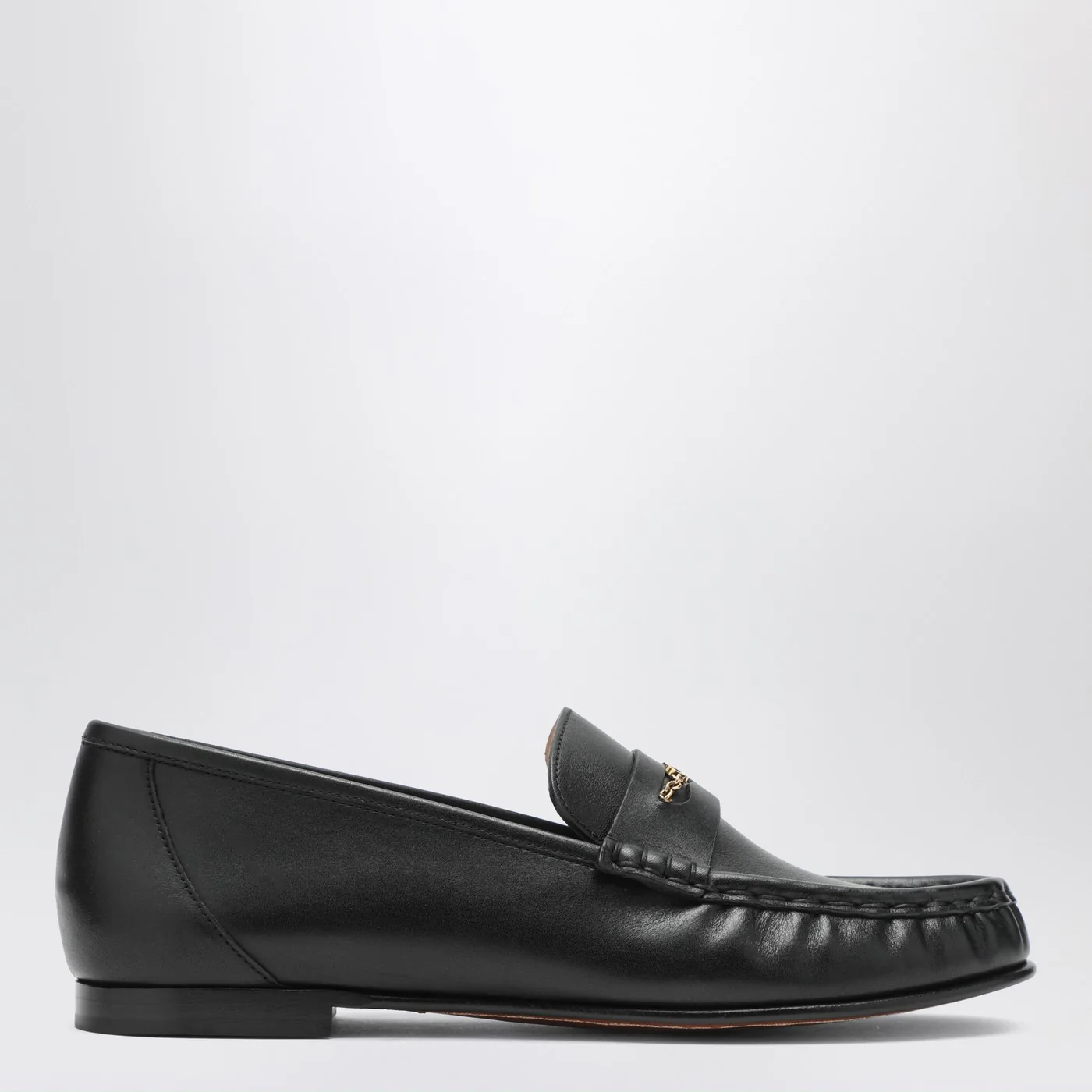 Chloé black leather loafers featuring a chain detail with gold metal logo round toe and leather sole.