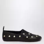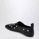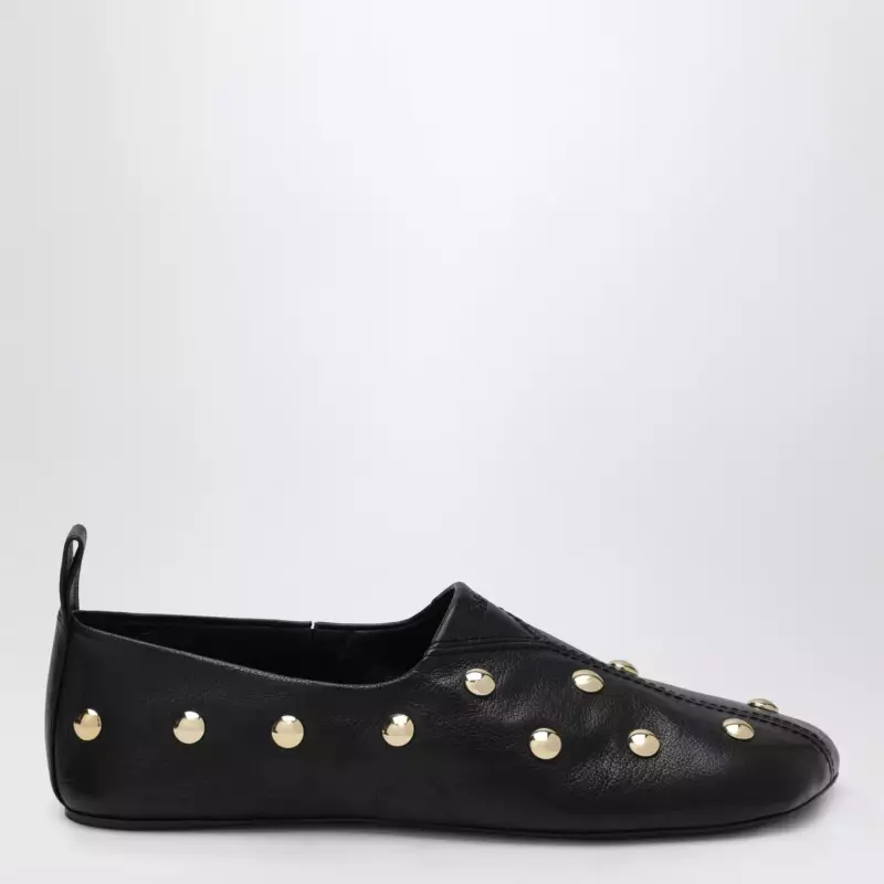 Ballet flats by Chlo in black leather all over gold tone metal stud embellishment rear pull tab rubber sole.