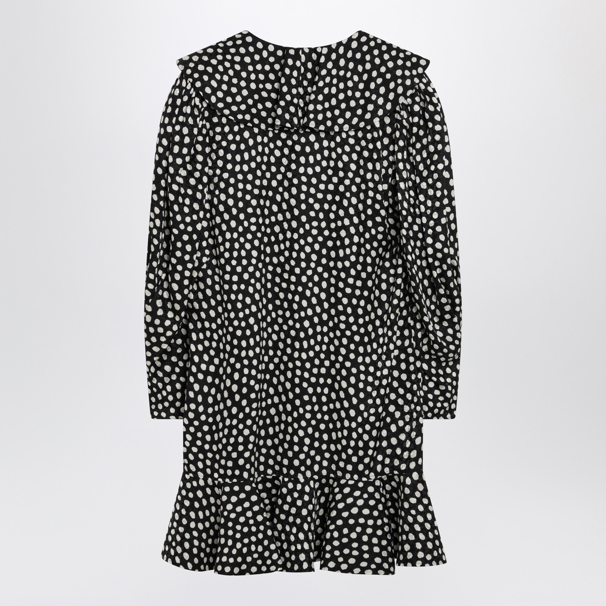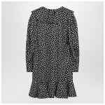Black silk jacquard Chloé mini dress with polka-dot print, featuring a V-neck with ruffles, long sleeves with buttoned cuffs, front covered button fastening, ruffled hem and fluid fit.