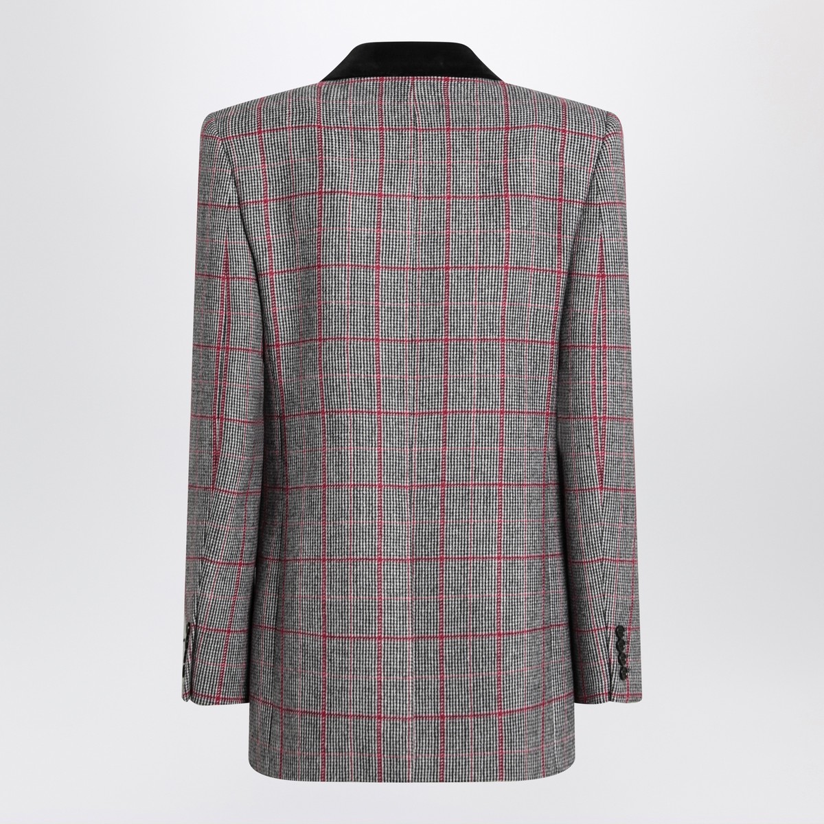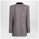 Double-breasted Chloé jacket in black, white, and red virgin wool with a check pattern, featuring pointed lapels with a black velvet detail, long sleeves with buttoned cuffs, a welt pocket on the chest, two flap pockets on the front, front buttoning, and a back vent.