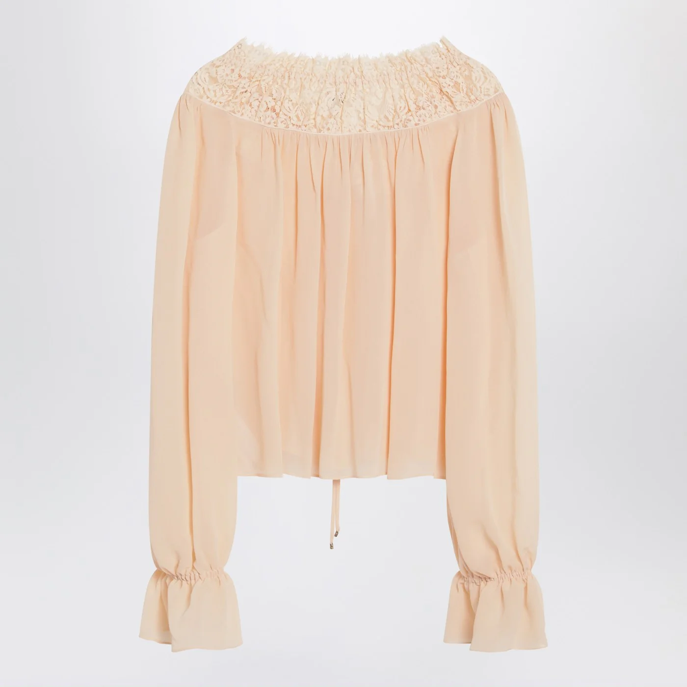 Chloé shirt in pink silk georgette featuring a lace collar with ruffles and a tie drawstring at the front and long bell sleeves with elasticated cuffs.