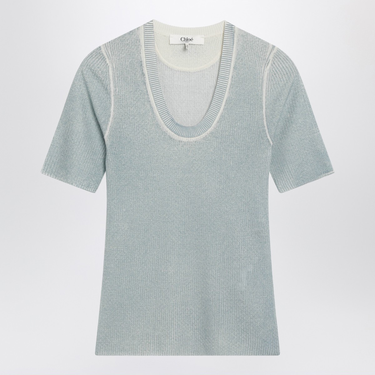 Blue-grey wool-blend knit top by Chloé, featuring a wide round neckline, short sleeves, ribbed design, tonal embroidered logo lettering on the back, and fitted silhouette.