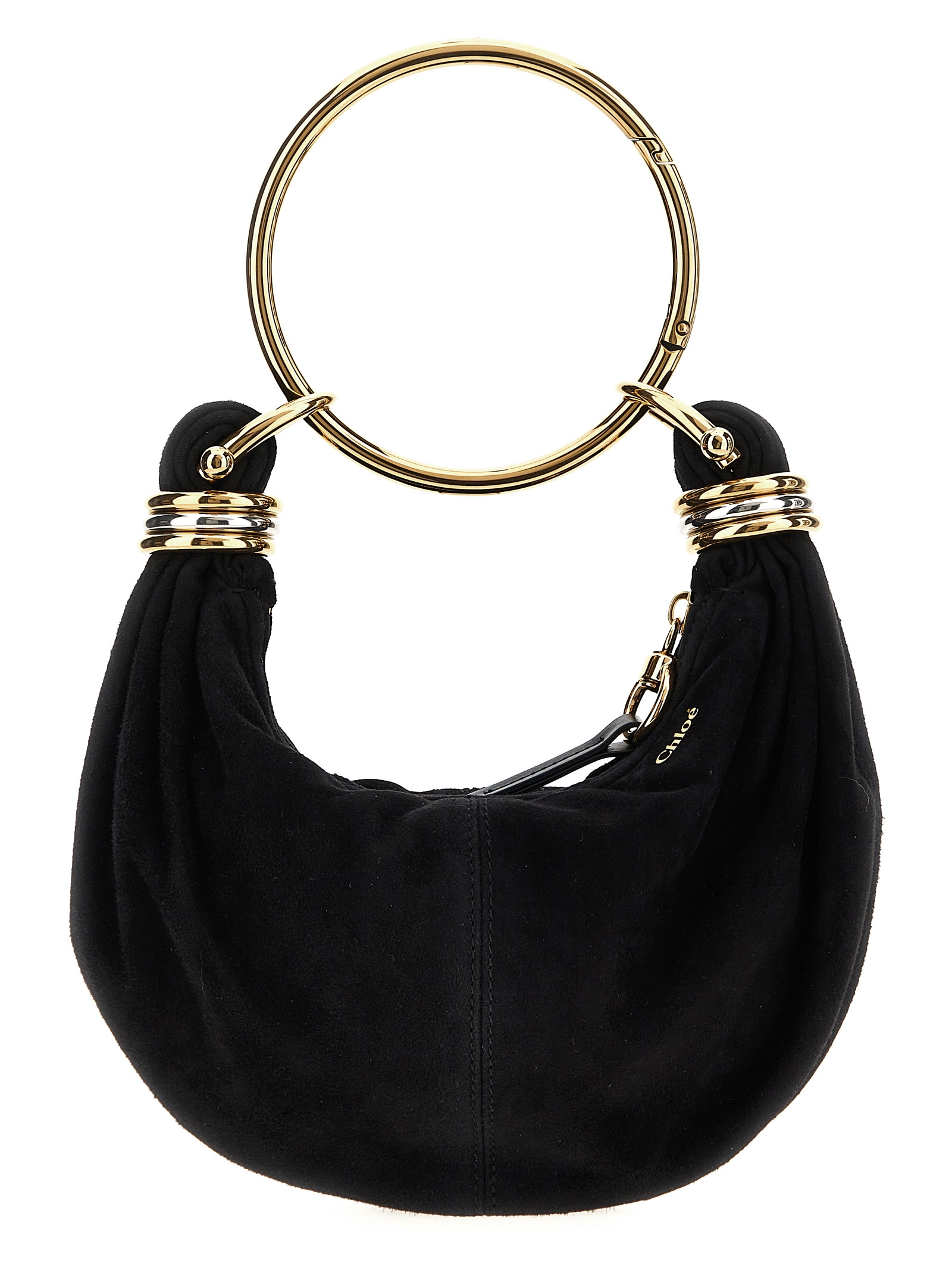 ‘Bracelet Hobo mini’ suede handbag with removable metal bracelet handle, zip closure, two-tone side metal rings decoration, adjustable and removable leather shoulder strap.
