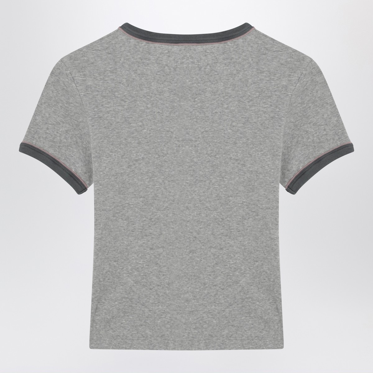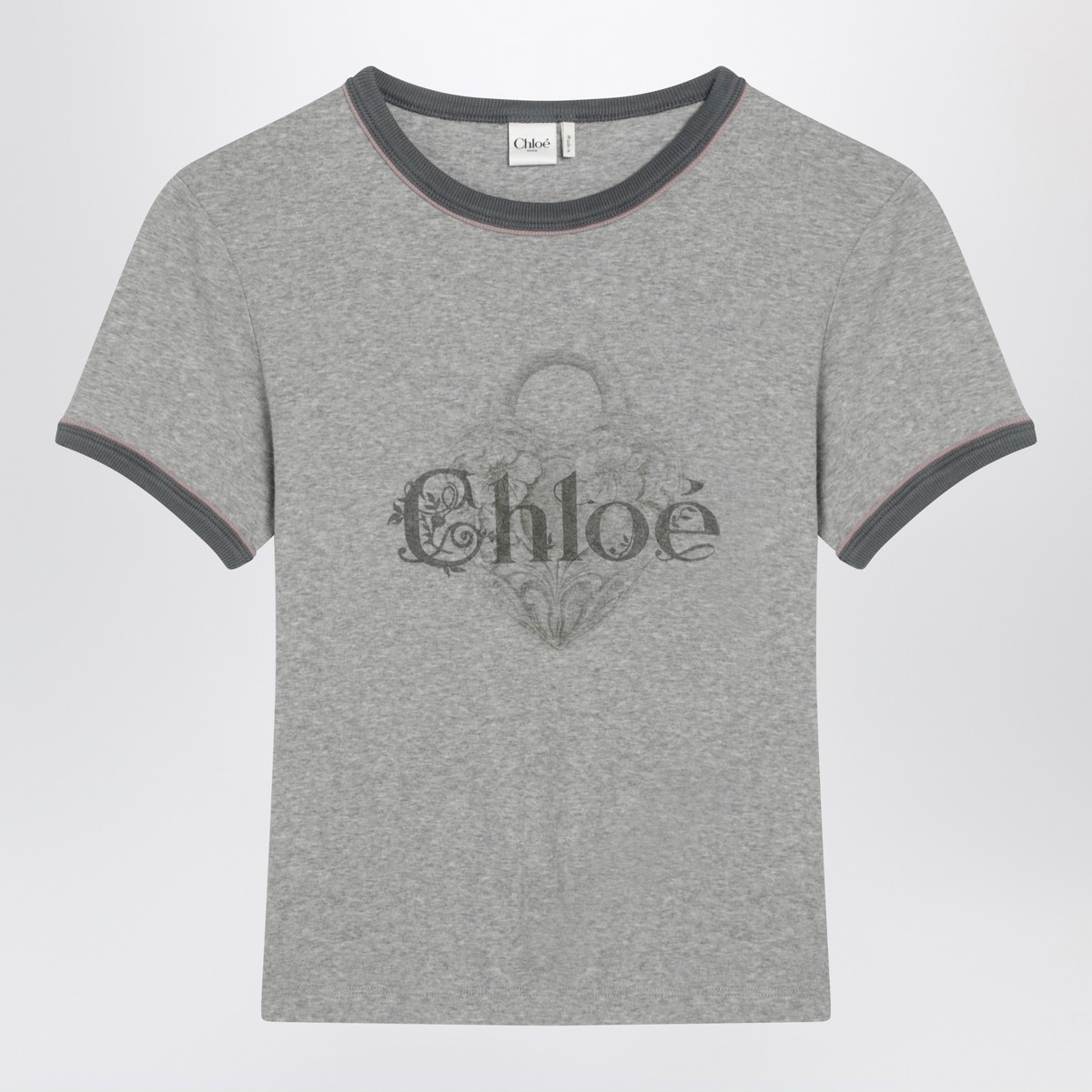 Chloé T-shirt in grey chiné cotton jersey featuring a faded heart-lock and logo lettering print, ribbed contrasting crewneck and armholes, and baby-fit silhouette.