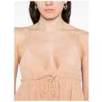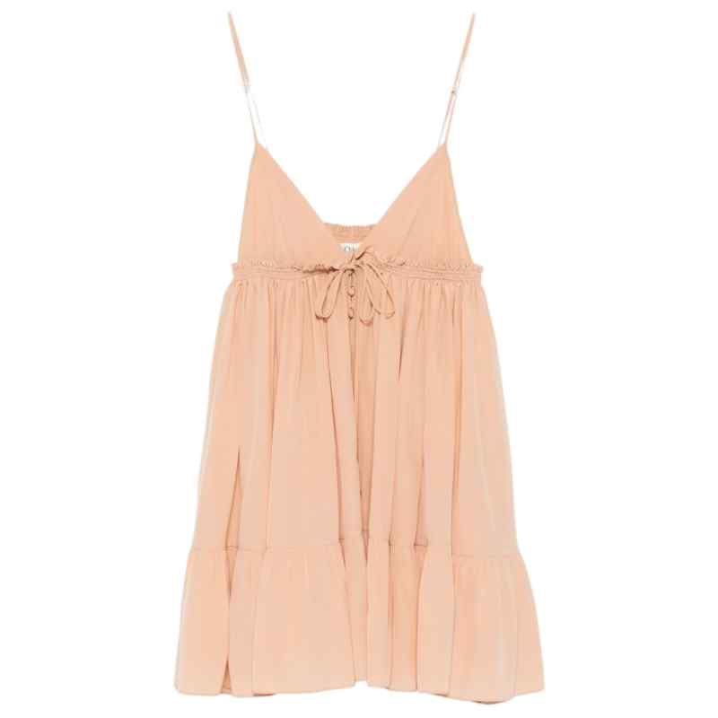 light beige tiered skirt ruffled trim self-tie fastening thin shoulder straps Silk mini dress.