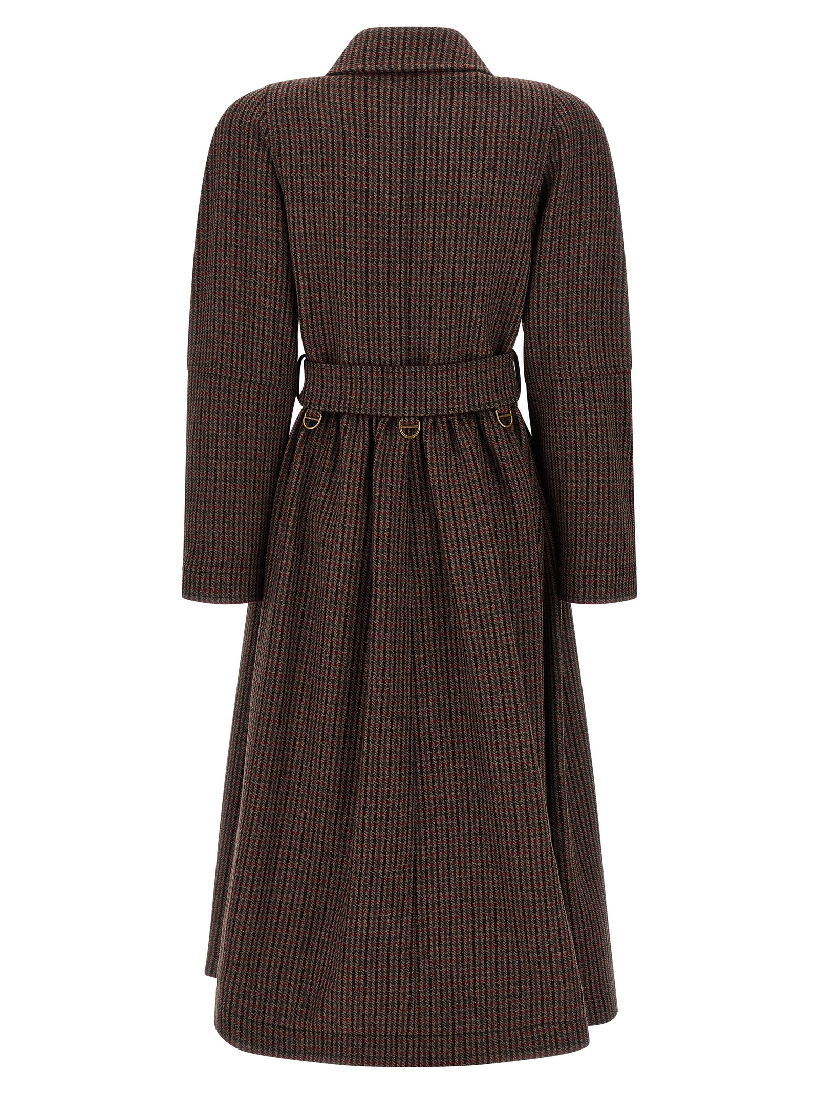 Pied-de-Poule, double-breasted riding wool coat with front button closure, shirt collar, pockets, padded shoulder, long sleeves with buttons on the cuffs, removable belt, viscose and cotton blend lining.