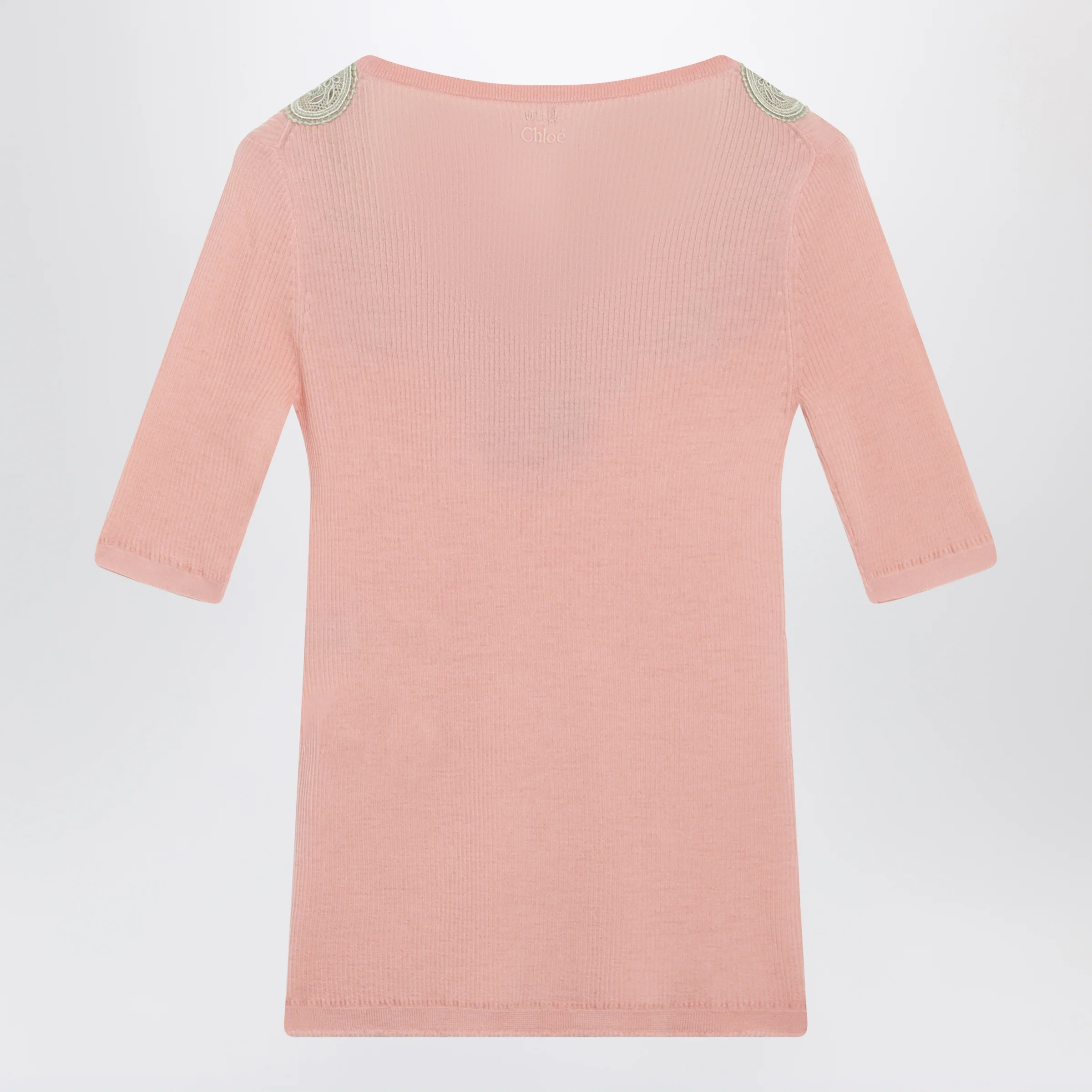 Chloé Fitted elbow-sleeve ribbed wool sweater with lace trim in pink