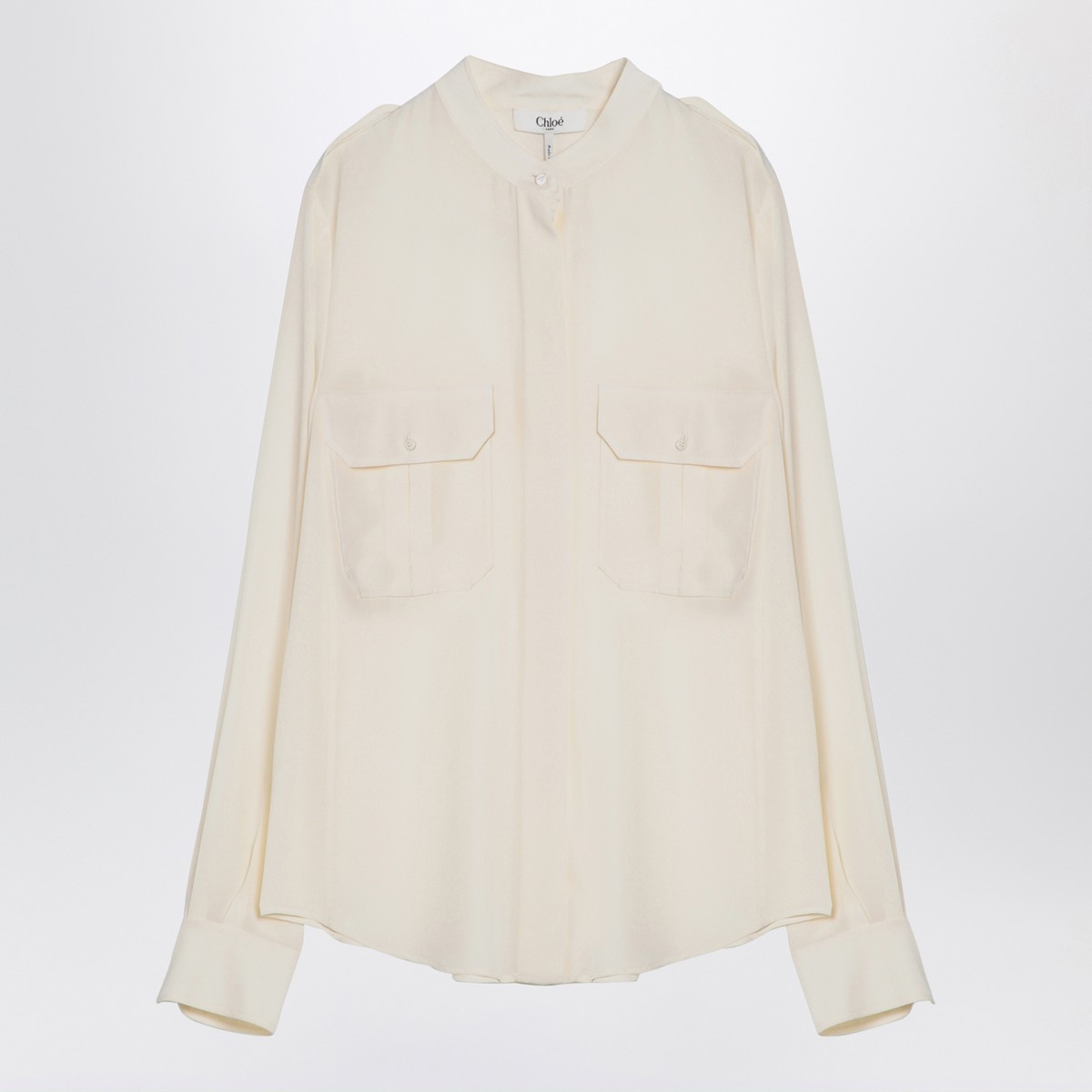 Ivory silk blouse from Chloé featuring a mandarin collar, a concealed front button placket, long sleeves with buttoned cuffs, two flap and buttoned breast pockets and shoulder insignia.