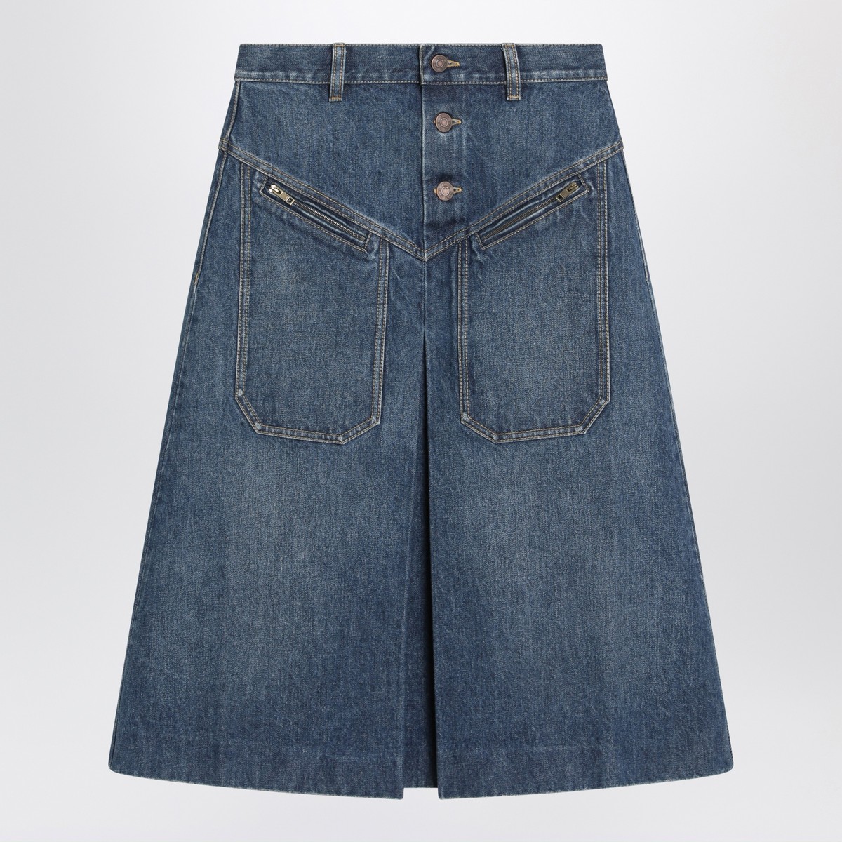 Washed blue cotton denim skirt from Chloé featuring belt loops at the waist, a button fastening, a front pleat, oversized front zipped pockets and a logo label to the reverse.