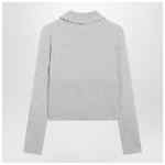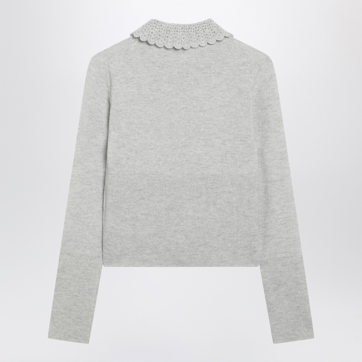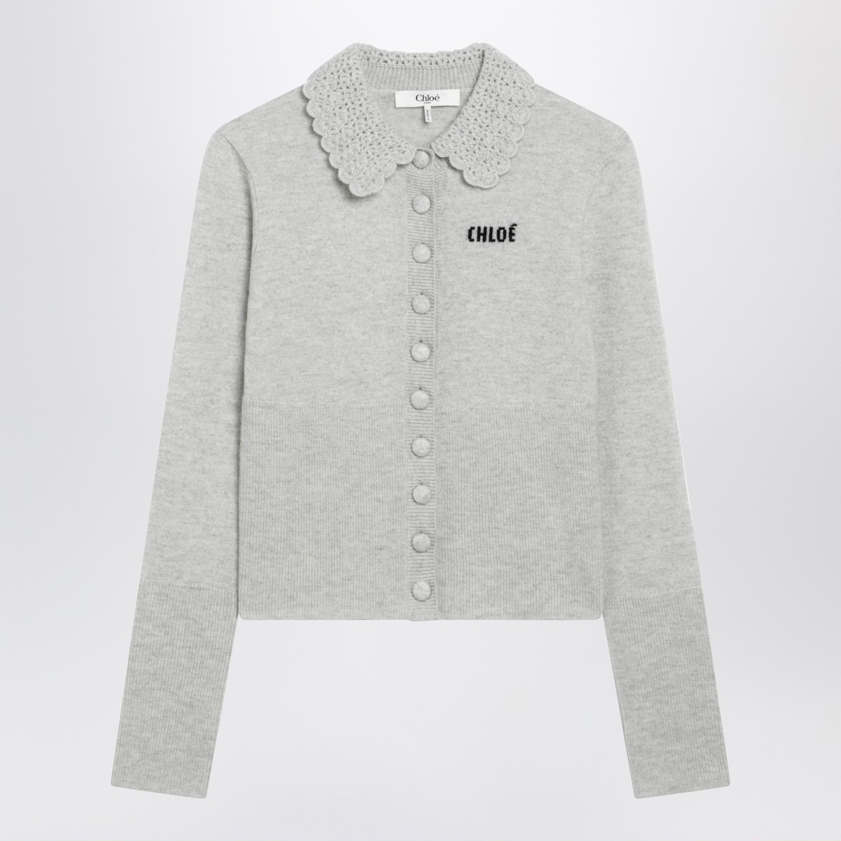 Light grey wool cardigan by Chloé, featuring front closure with covered buttons, long sleeves, fitted silhouette, ribbed trims, wide knitted collar, and contrasting intarsia logo lettering on the chest.