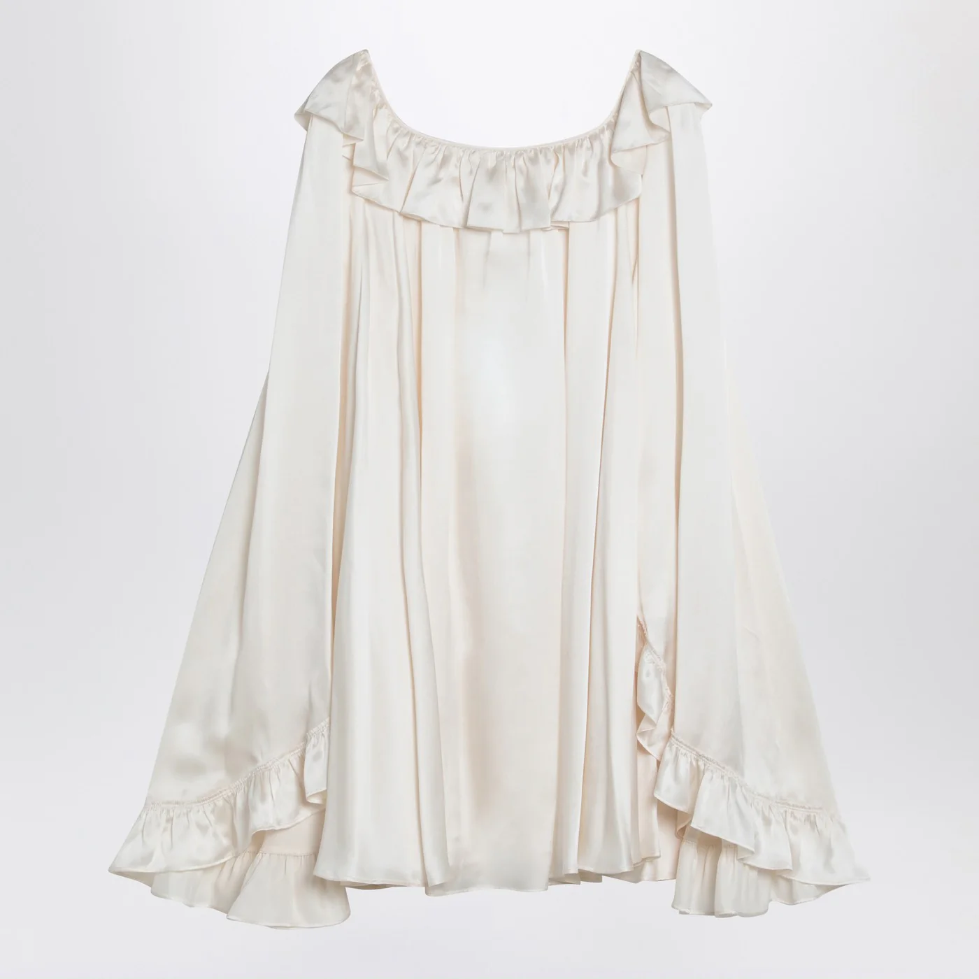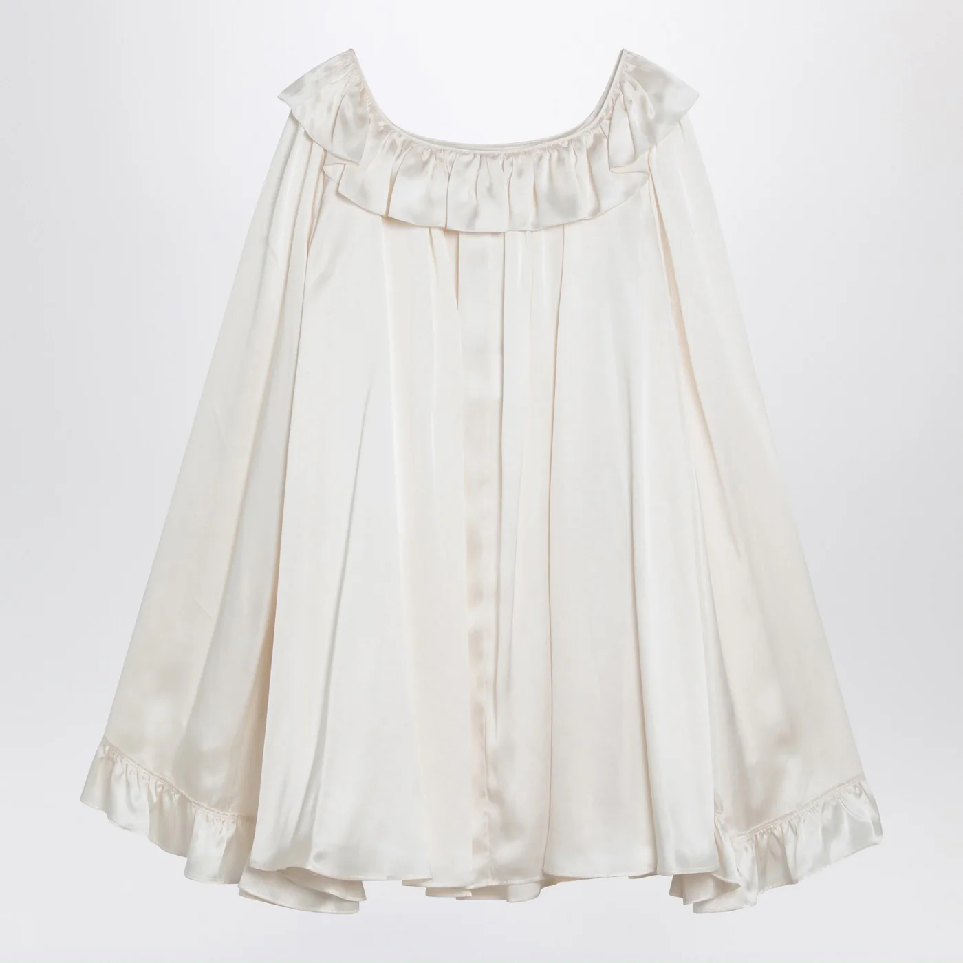Chloé mini dress in milk white silk characterized by a wide and fluid design with sleeves and a square neckline with ruffles.