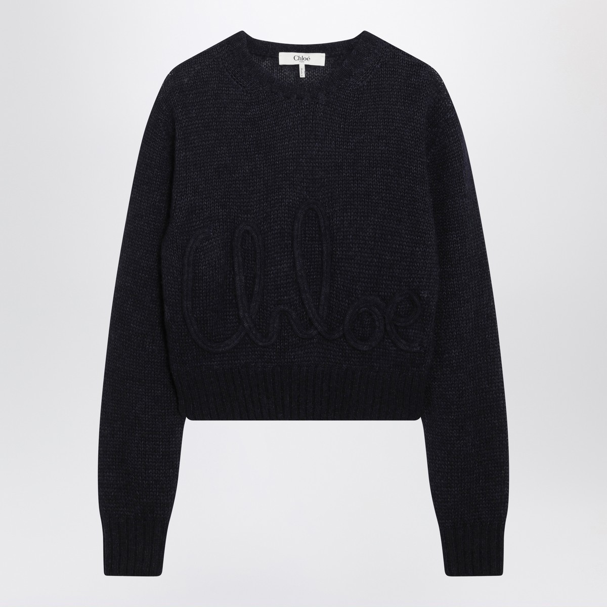 Chloé navy blue alpaca-blend sweater featuring crew neck design, front logo embroidery, long sleeves and ribbed cuffs and hem.