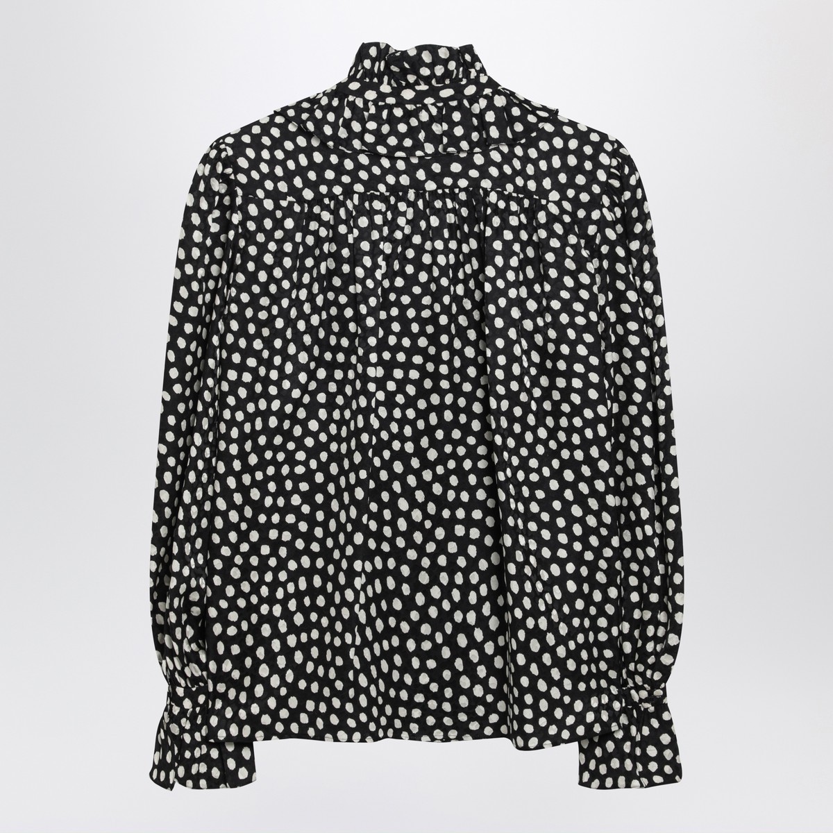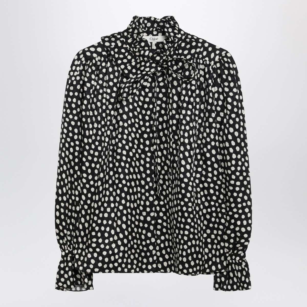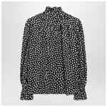 Chloé silk blouse featuring black and white polka-dot motif, high collar with buttons and bow, ruffled front design and ruffled cuffs.