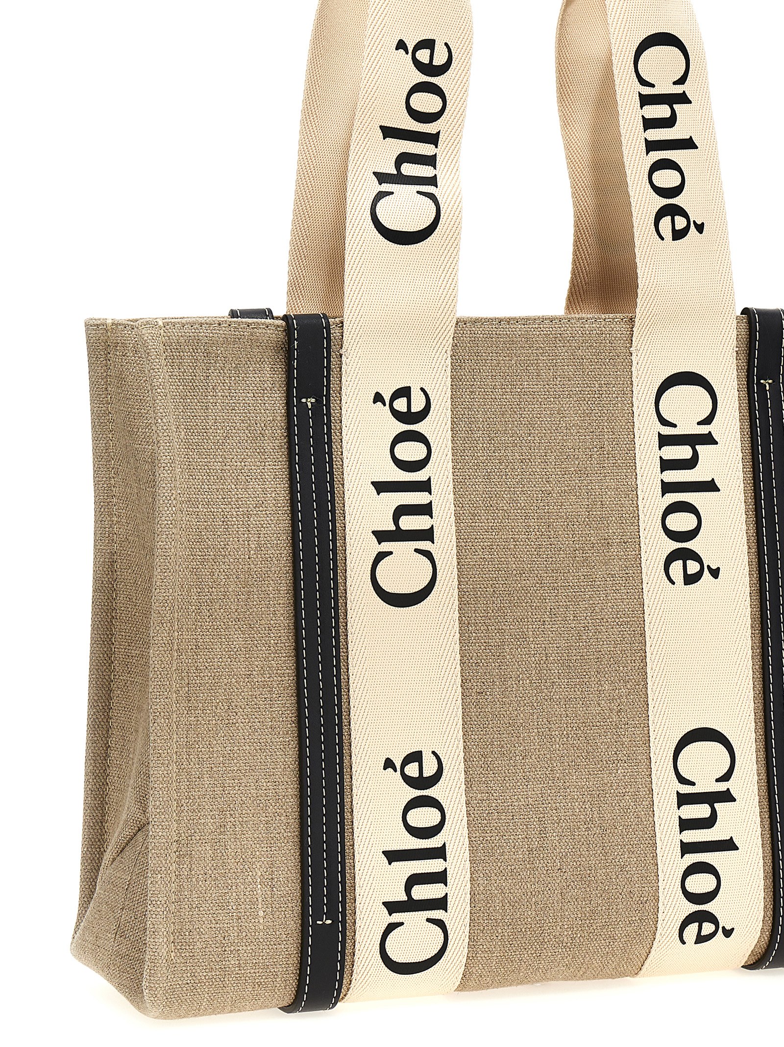 ‘Woody Medium’ shopping bag in canvas featuring leather details and logo handles.