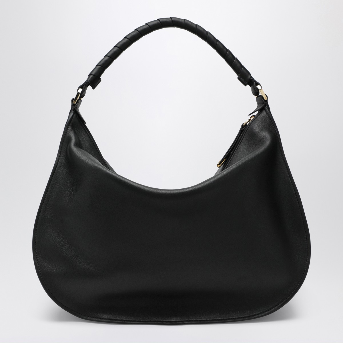Shoulder bag by Chloé in black leather, featuring top handle, front flap, zip closure, spacious main compartment, open front pocket hidden under the flap, and internal flat pocket.