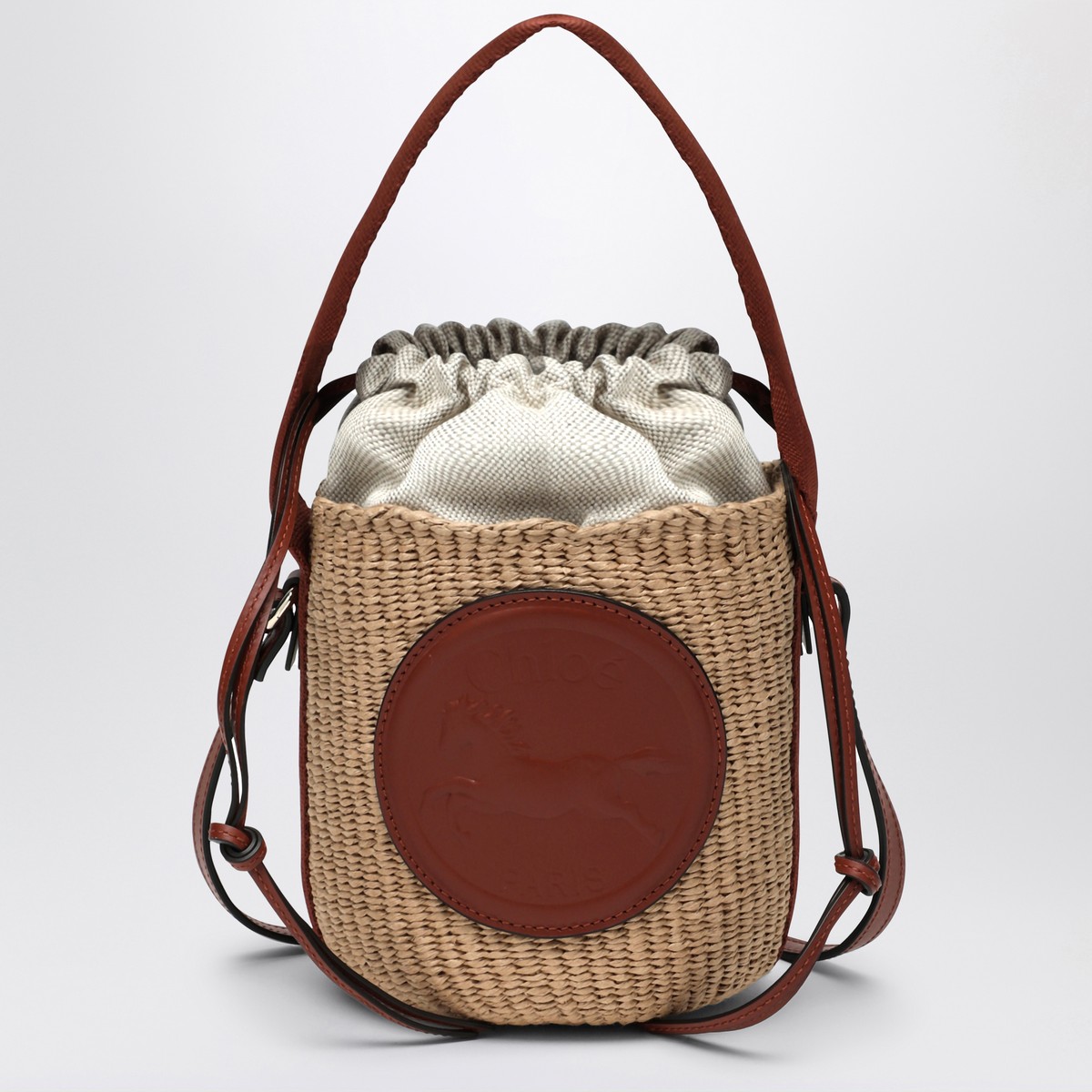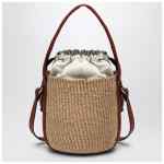 Small tote bag by Chloé handmade in fair-trade paper and brown calf leather, featuring an adjustable and removable shoulder strap, a single leather handle, a leather tag with logo applied on the front, and an internal canvas pouch with drawstring.