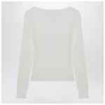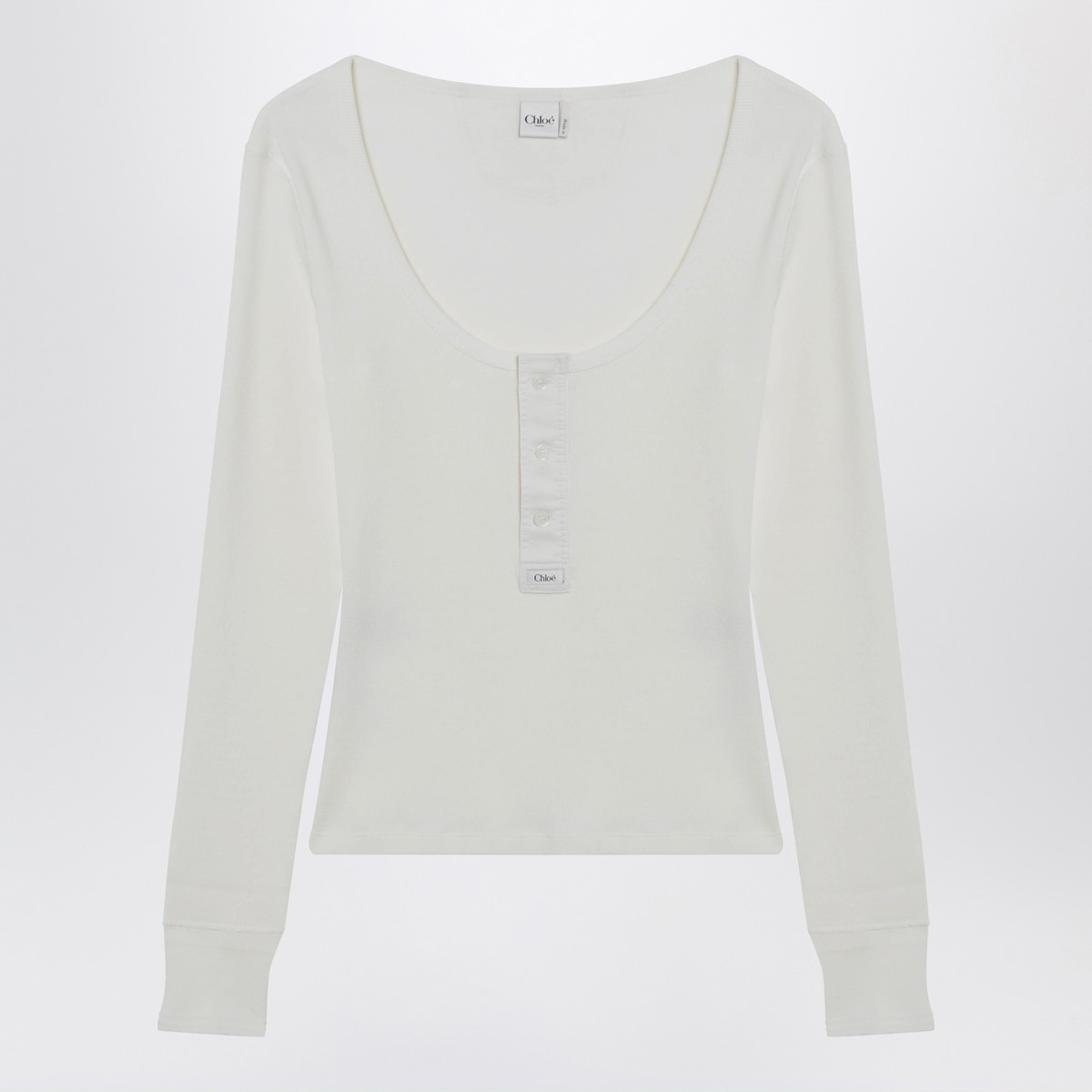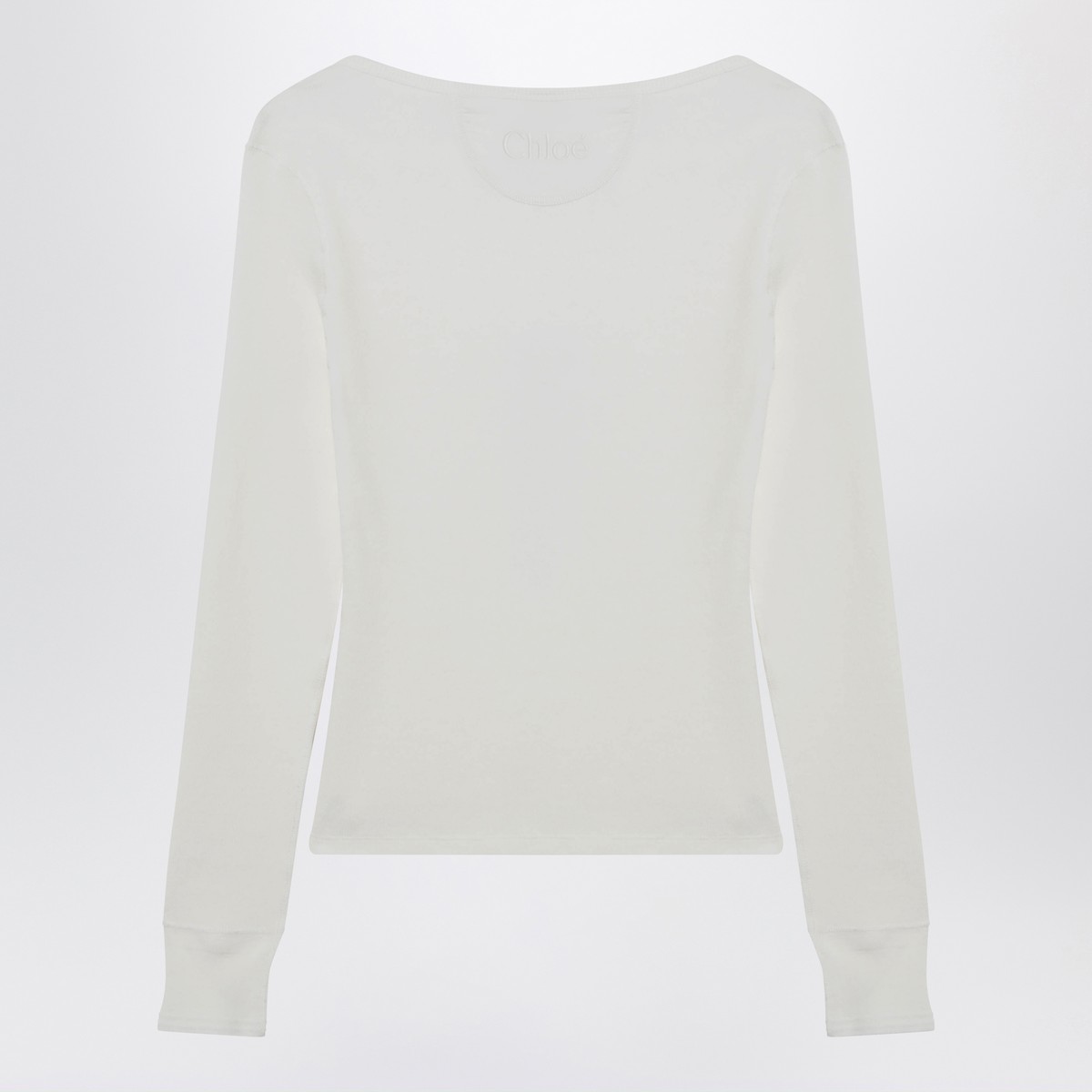 Milk-white cotton jersey Chloé top, featuring a wide crew neck, front buttons, logo lettering patch, long sleeves, fitted silhouette, ribbed design and tonal embroidered logo lettering on the back.