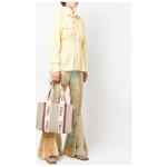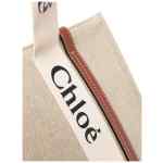white/brown linen canvas leather trim logo print embellishment circular top handles open top Woody canvas medium tote