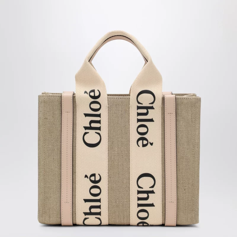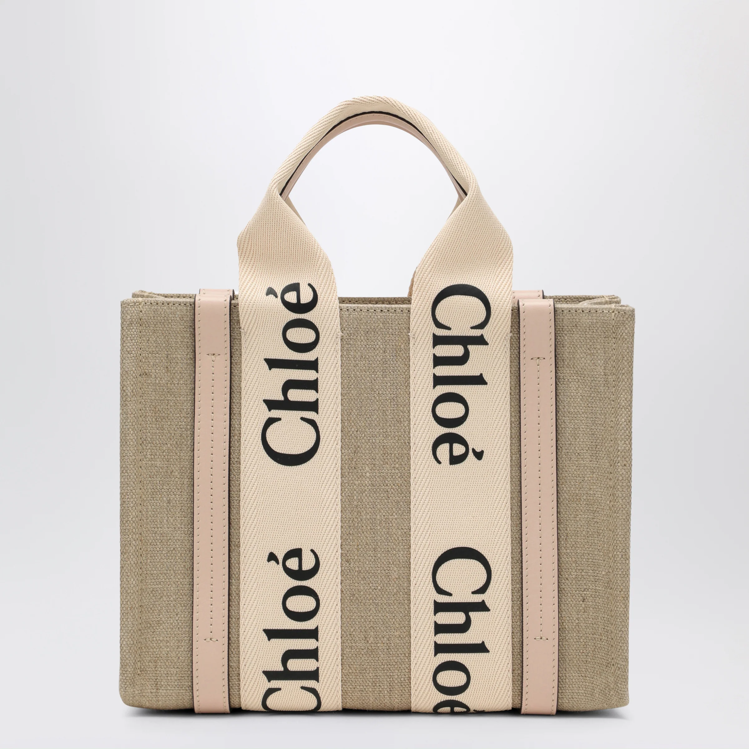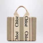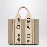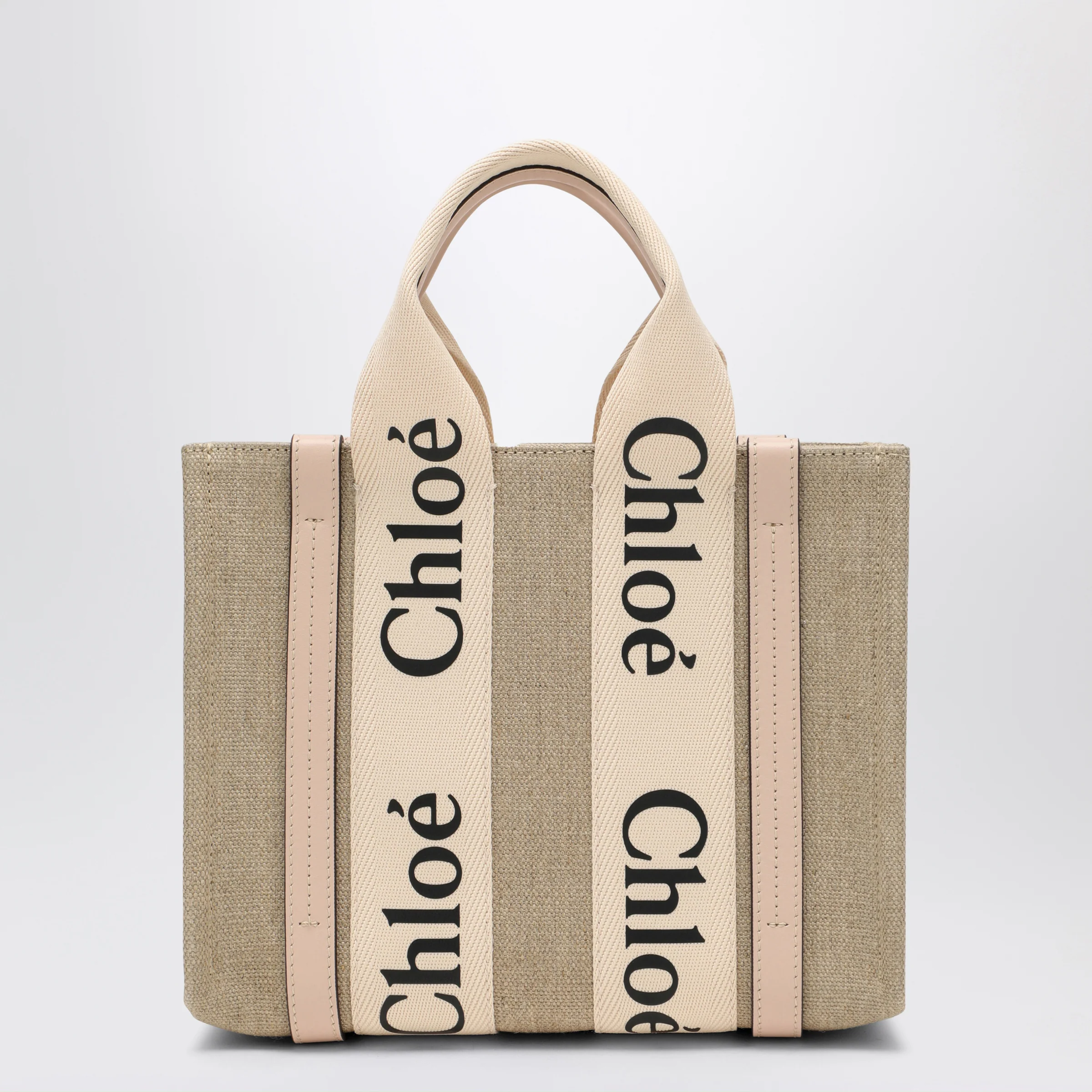 Small shopping bag by Chloé in beige cotton canvas with calfskin leather inserts