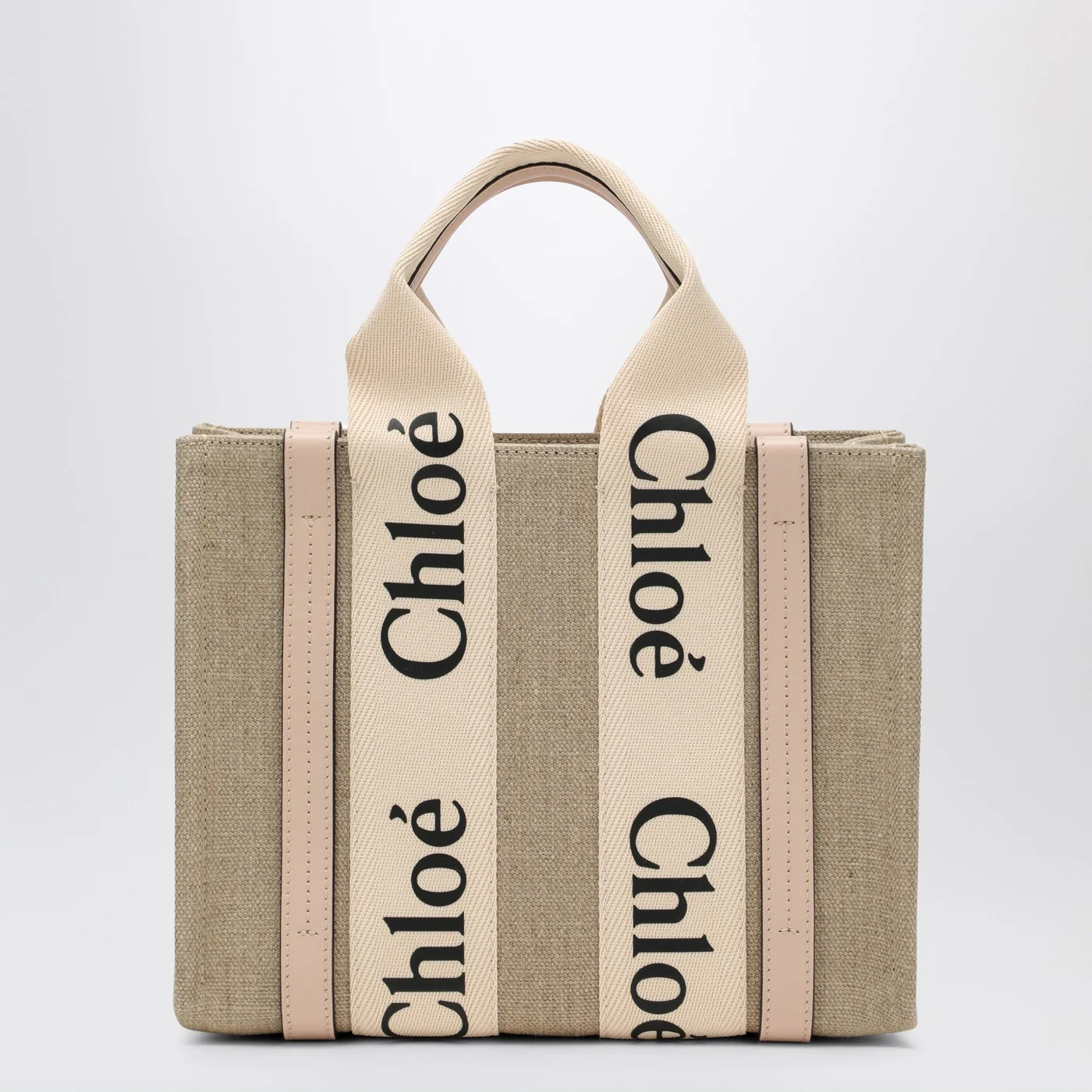 Small shopping bag by Chloé made of beige cotton canvas and pink calfskin leather inserts featuring two handles a main compartment an internal flat pocket and a contrasting Woody ribbon with logo inscription.
