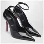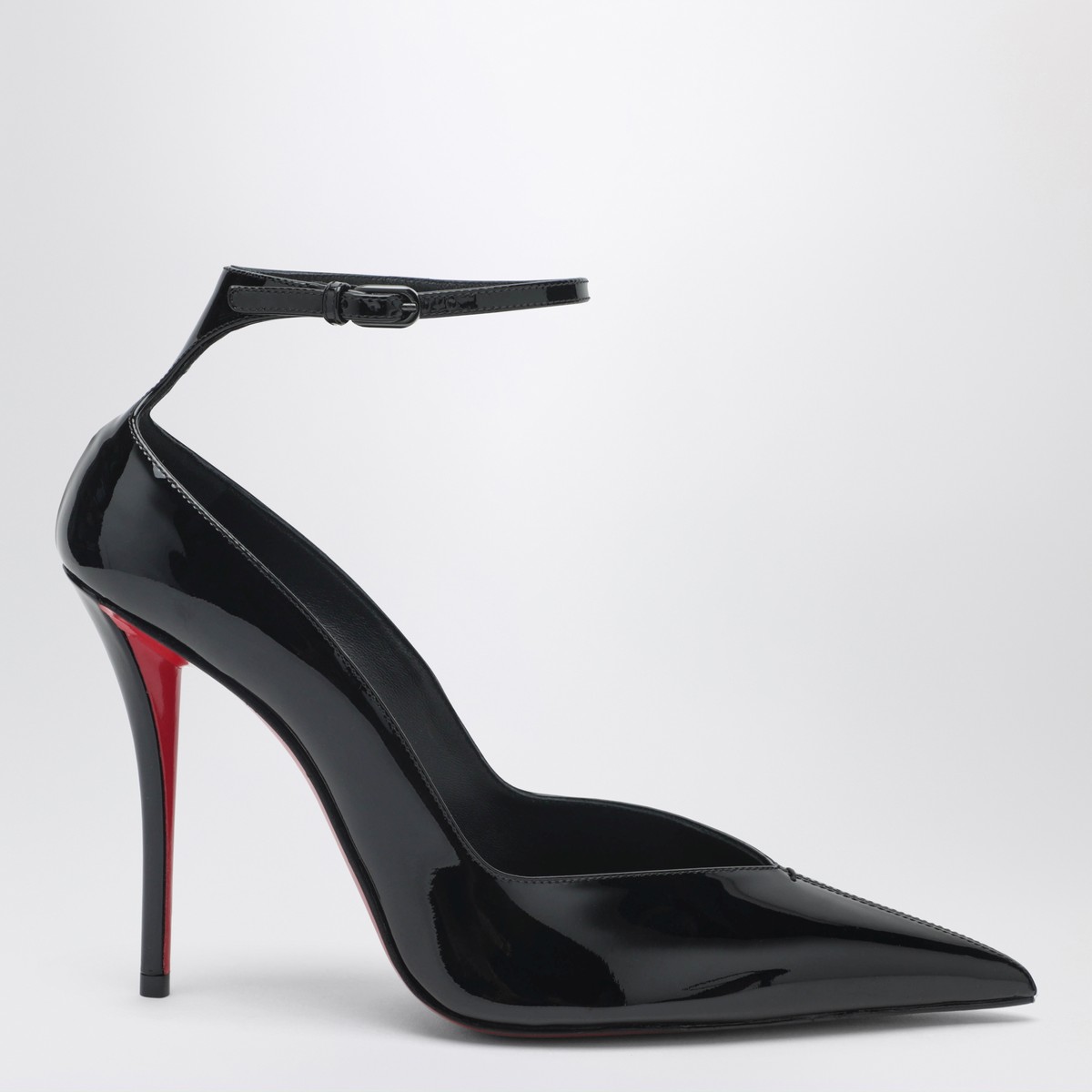 Christian Louboutin pumps in black patent leather, featuring an adjustable ankle strap, pointed toe, high stiletto heel and iconic red leather sole.