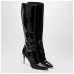 Black patent leather high boot from Christian Louboutin featuring a high boot leg, a pointed toe design, side logo detail, a side zip fastening and an iconic red sole.