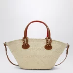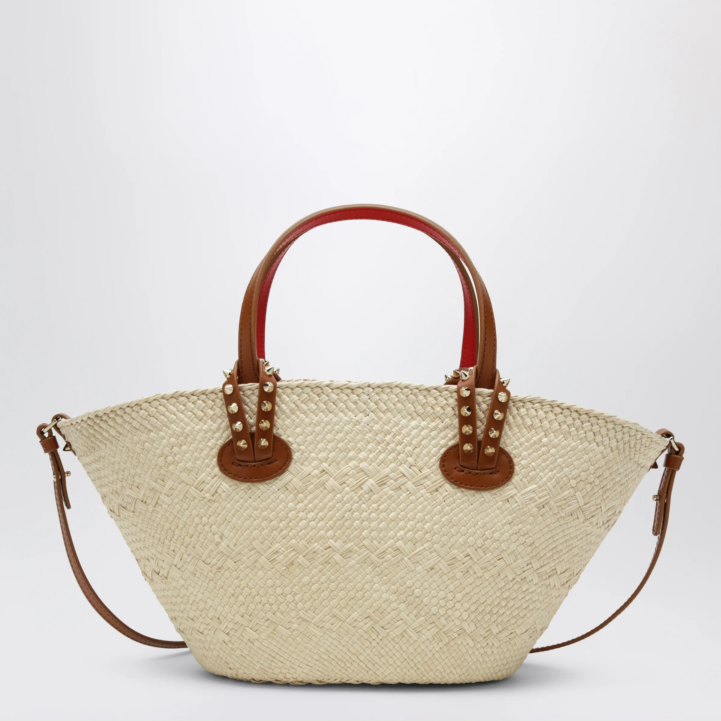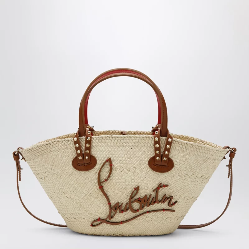 Small size tote bag by Christian Louboutin in raffia Colour Natural Brown Leather details Two top handles with metal spike Contrasting lettering logo on the front. Size and Fit – Width 19 cm x Height 18 cm x Depth 10 cm Handle drop: 15 cm