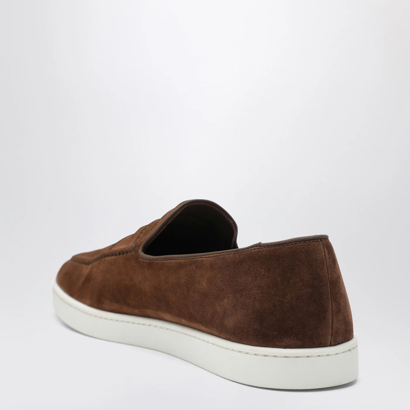 Loafers by Church s in brown suede leather flexible Strobel construction slipper style with Adler stitching along apron and strap removable leather lined insole rubber sole.