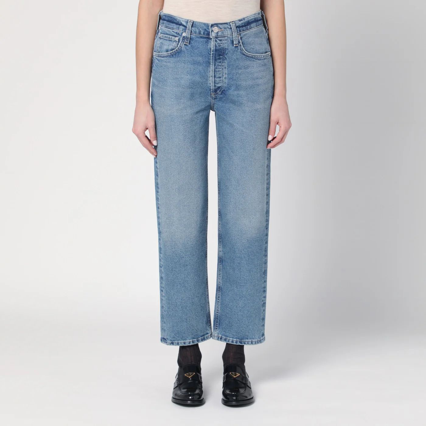 Citizens of Humanity jeans in light blue cotton denim with a faded effect characterized by a front closure with zip and button high waist with belt loops five classic pockets a back logo patch and a small logo tag.
