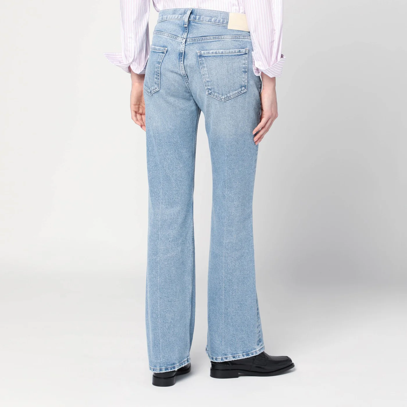 Citizens of Humanity jeans in blue cotton denim with a faded effect featuring a front zip and button closure belt loops five classic pockets a back logo patch and a small logo tag.