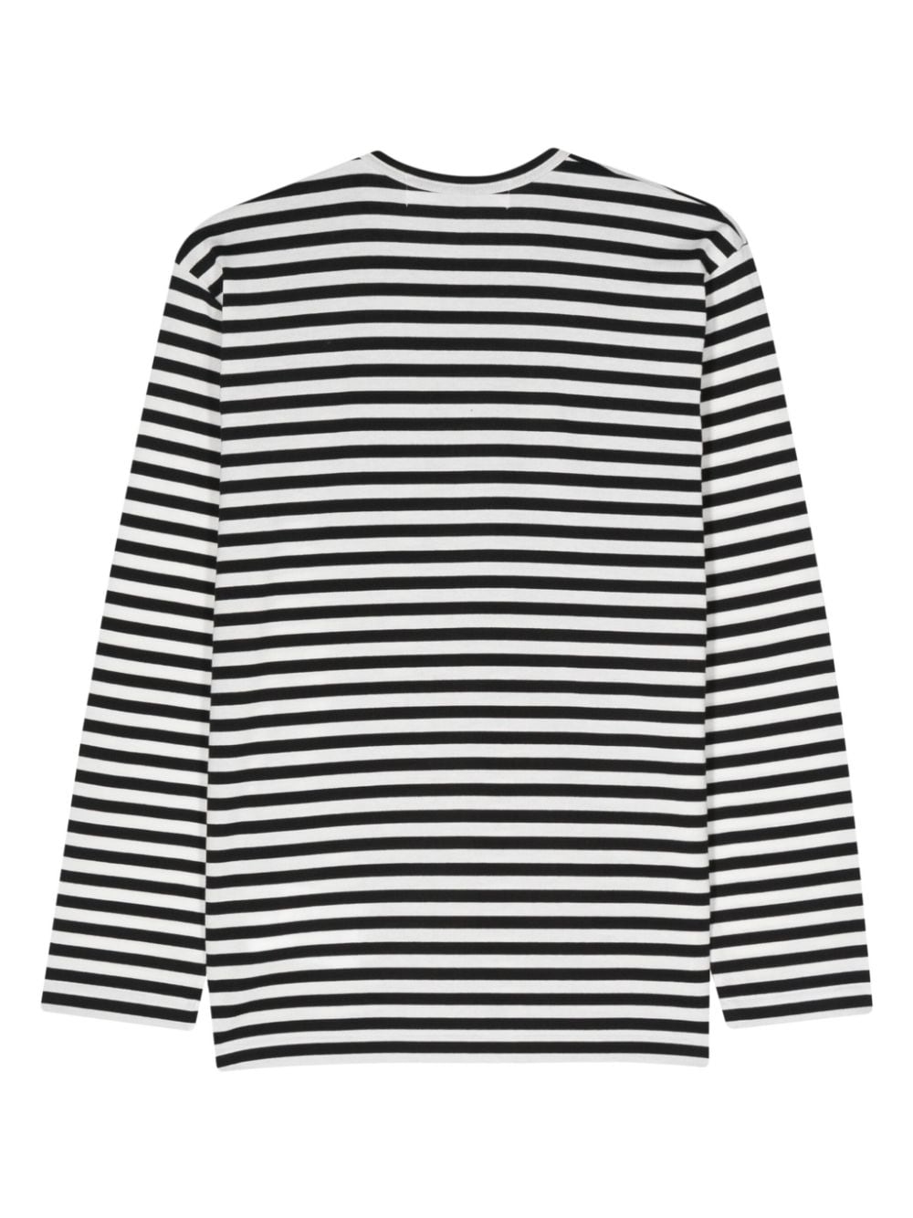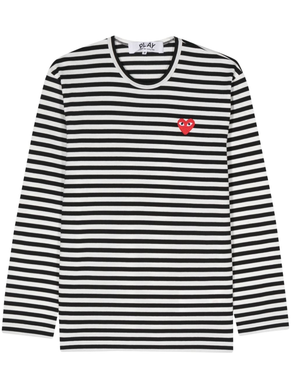 Black, white cotton jersey texture horizontal stripe pattern crew neck long sleeves signature heart patch at the chest straight hem. Striped cotton t-shirt.